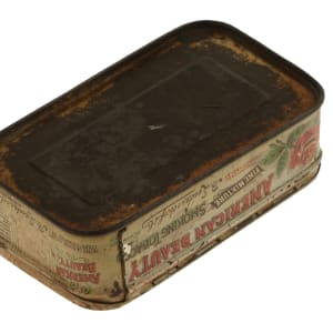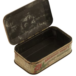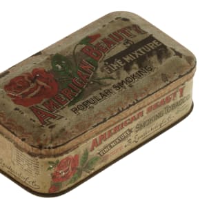 This rare American Beauty tin, which has a direct connection to multiple baseball card issues, features an illustration of a rose on the lid. The text on the lid reads "American Beauty/Fine Mixture/Popular Smoking." The tin exhibits several areas of flaking and other surface imperfections. Overall in Fair condition. Dimensions: 5 x 2 x 1.25 inches. The size/weight of this item requires that there will be an additional shipping charge for this lot.