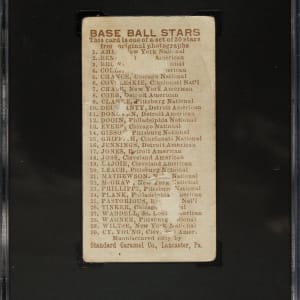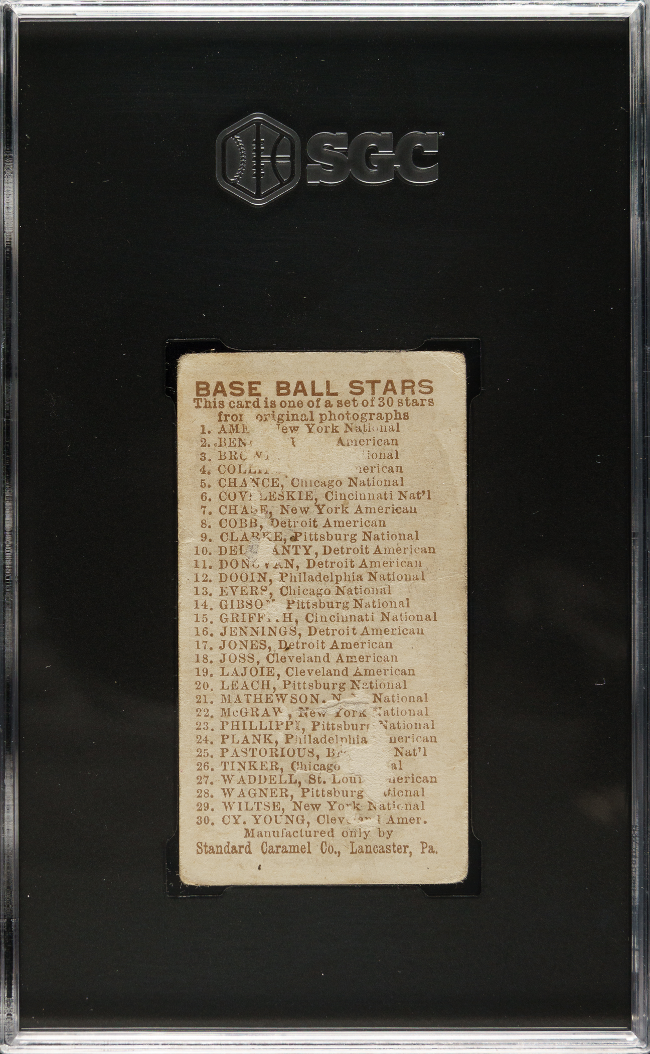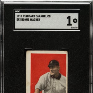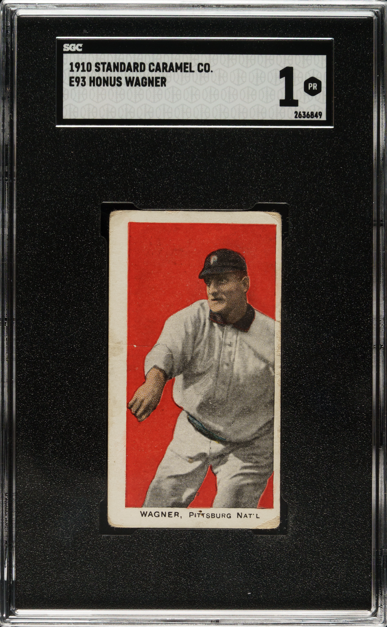 Modestly graded example of Pittsburgh Pirates Hall of Famer Honus Wagner in a throwing pose from the E93 Standard Caramel series. This 30-card set was issued in 1910 by the Standard Caramel Co. of Lancaster, Pennsylvania. This set is closely related to several other candy sets from the era that share the same format and in many cases the same player image. The offered card has bright colors, outstanding registration, and moderate corner wear. Graded POOR 1 by SGC, condition issues include light creasing and scattered spots of paper loss on the reverse.