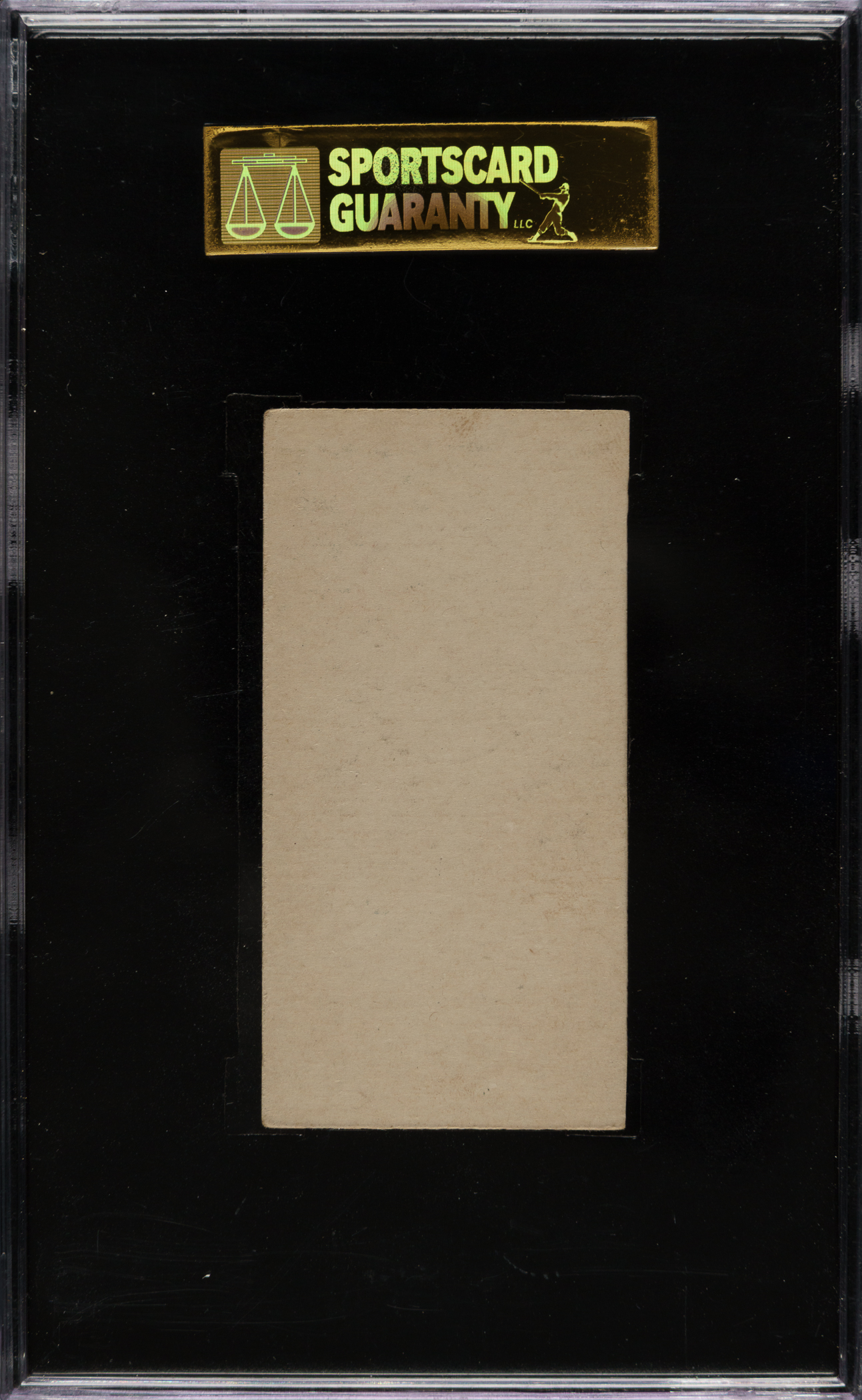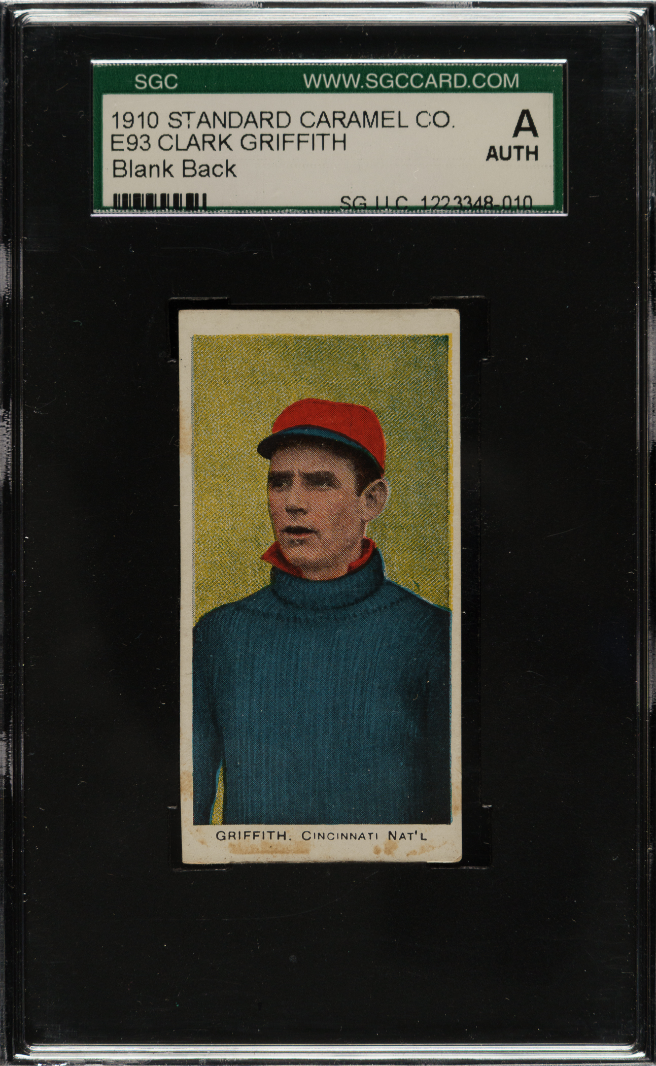 Extremely unusual and rare E93 printing variation card features Hall of Famer Clark Griffith. This card has a blank back. E93s are usually seen with a checklist of the set on the reverse. A small number of individual cards with blank backs (one complete set we have been told) was found along with the very small find of several partial E93 sheets which surfaced in 2006. Common sense tells us that this card may have been hand-cut from a sheet, possibly many years ago. Encapsulated as "Authentic" by SGC.