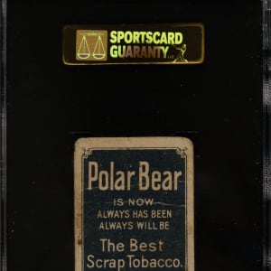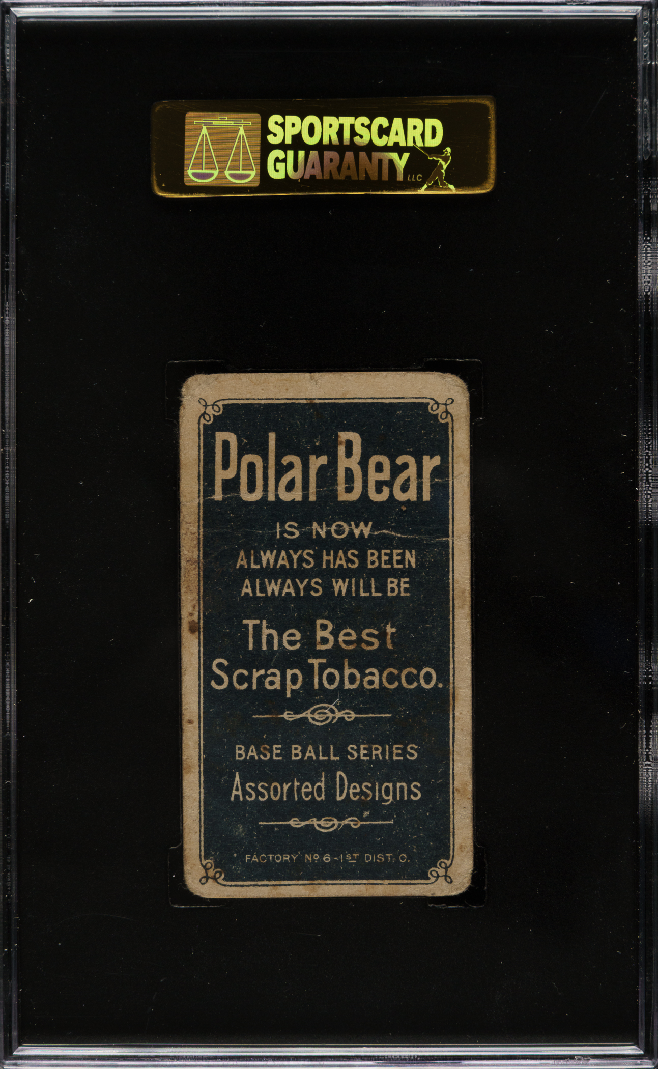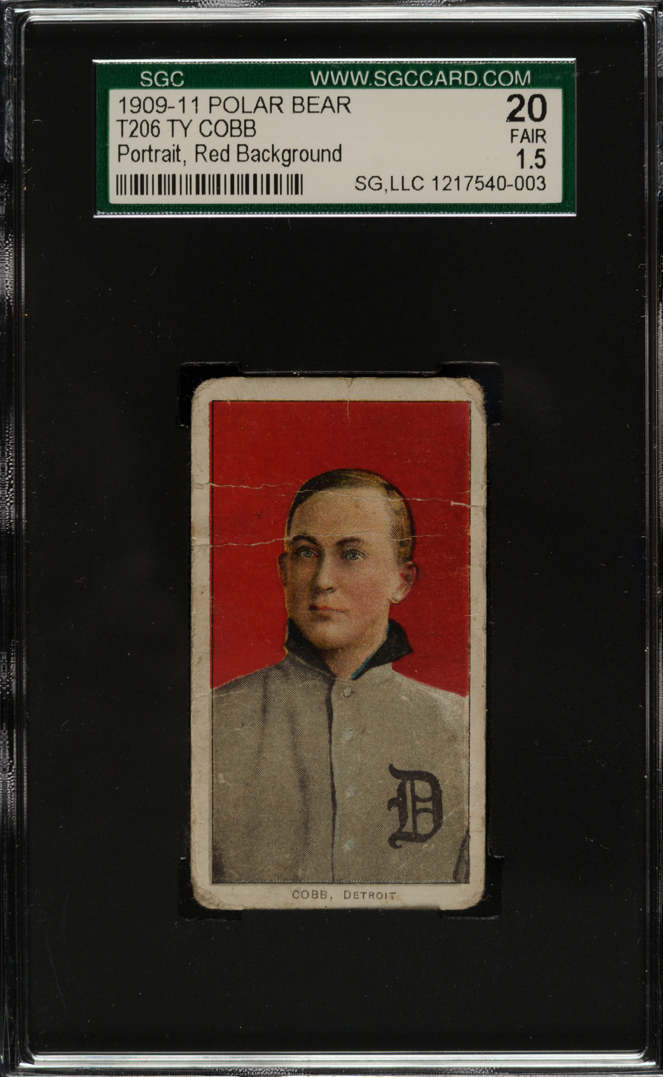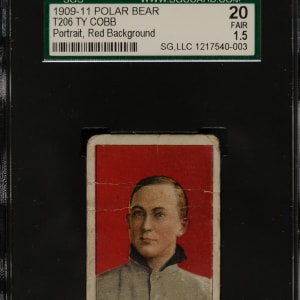 Graded FAIR 20 by SGC. Modestly graded example of the red-portrait Ty Cobb pose from the T206 White Border series with a Polar Bear advertising back. The card has a bright red background, excellent registration, heavy creasing, and rounded corners. Boldly printed Polar Bear advertising reverse. Extremely desirable example of this classic card.