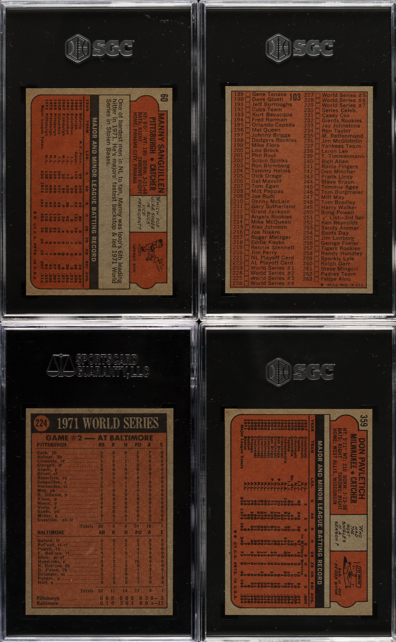 Collection of four 1972 Topps cards, each graded and encapsulated NM/MT 8 by SGC. This collection consists of the following: #60, 103, 224 (NM/MT 88), and 359. Total: 4 cards.