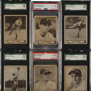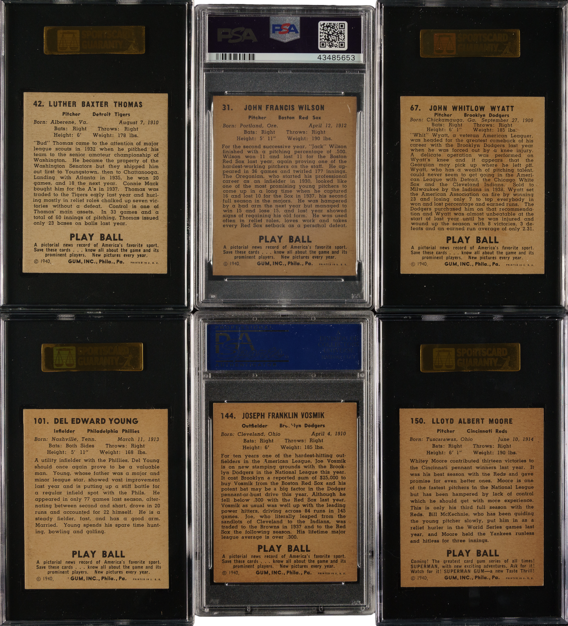 Collection of six 1940 R335 Play Ball cards, each graded and encapsulated EX/MT 80 by PSA or SGC. This collection consists of the following: #31 (PSA EX-MT 6), 42, 67, 101, 144 (PSA EX-MT 6), and 150. Total: 6 cards.
