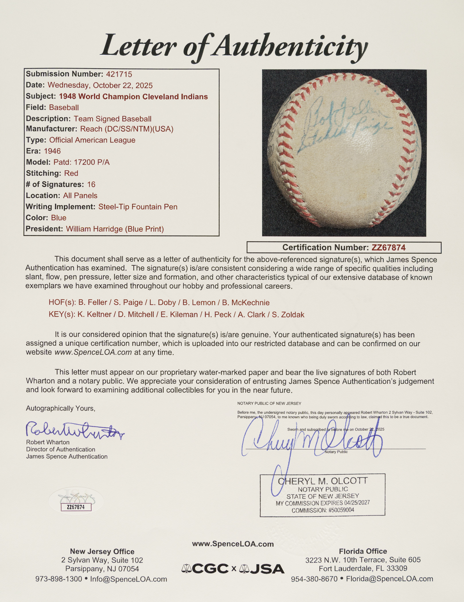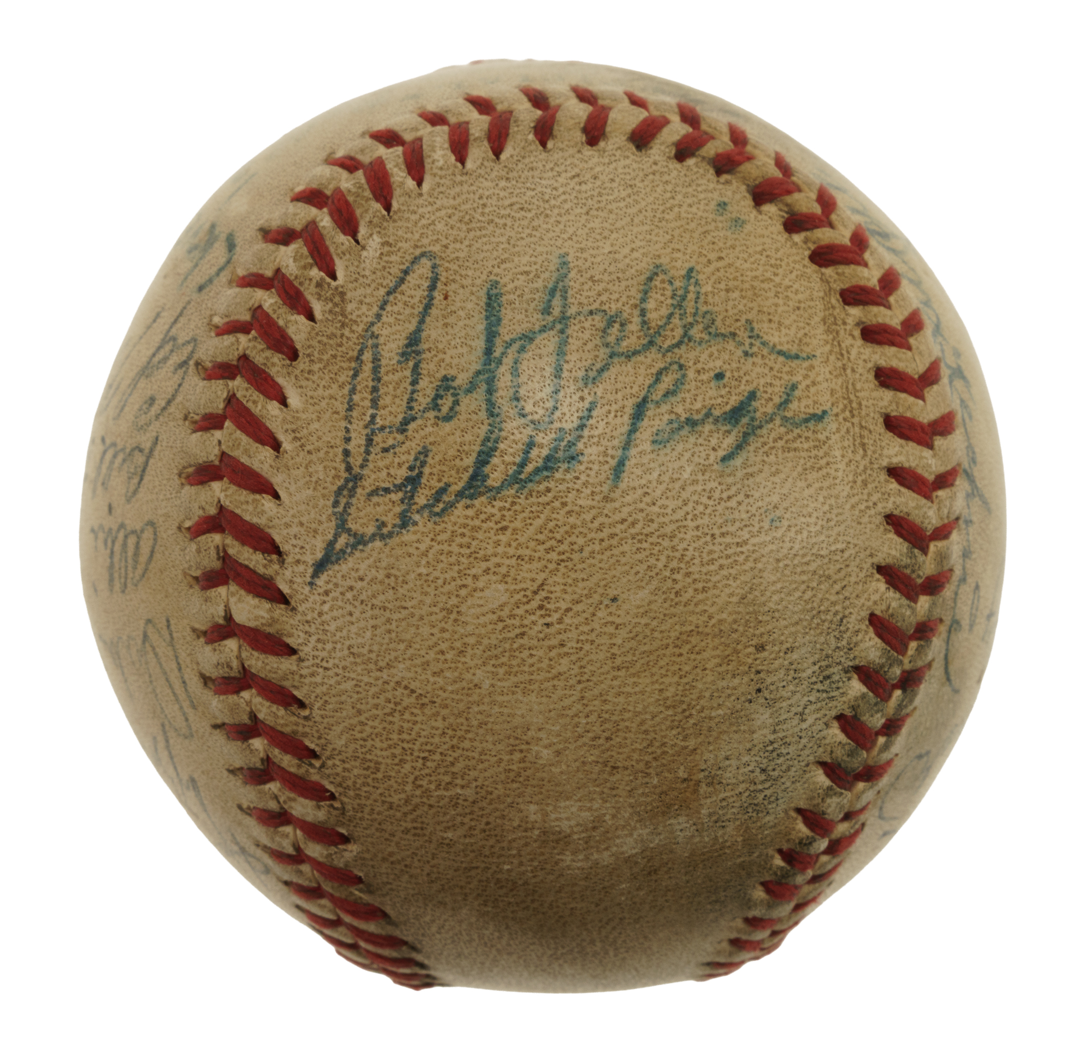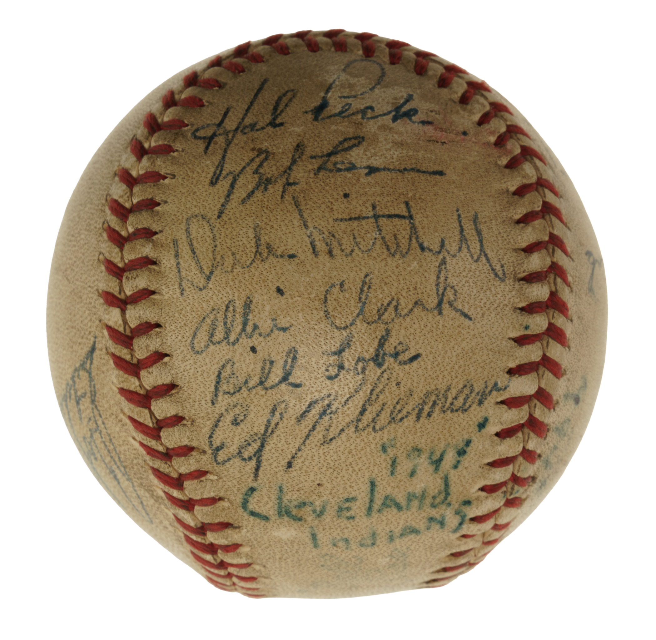 Official American League baseball (Harridge) signed in blue ink by 16 members of the 1948 World Champion Cleveland Indians. Notable signatures include Feller, Paige, Lemon, Mitchell, Keltner, and Doby. "1948 Cleveland Indians" is penned on one side panel while "1948" appears on another. The ball is soiled throughout, and the manufacturer's stampings are largely faded (but legible). Good condition overall. Full LOA from James Spence/JSA.
