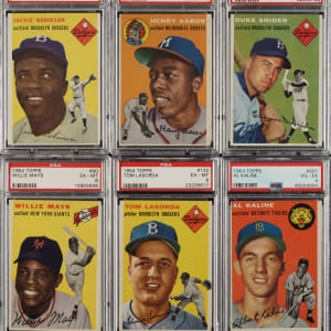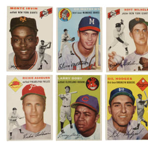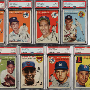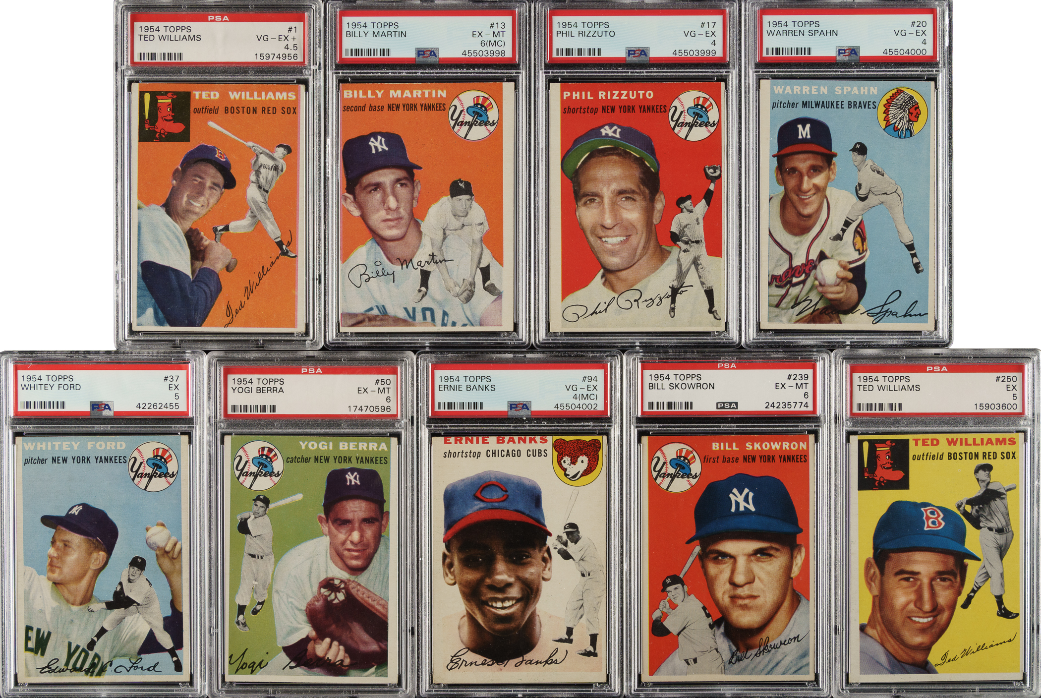 The 1954 Topps set has always been one of the most popular sets of the 1950s. Issued in the heart of the decade, the set features the rookie cards of Ernie Banks and Al Kaline, along with many other Hall of Famers and stars, including two examples of Ted Williams (first and last cards in the set), all in brilliant color. Seventy-six cards have been professionally graded and encapsulated by PSA. Grading Composite: NM-MT 8 (1 card): #32 Snider. NM+ 7.5 (1 card): #244. NM 7 (10 cards): #11, 42, 44, 46, 76 (MK), 136, 143, 146, 155, and 237. EX-MT+ 6.5 (2 cards): #133 and 160. EX-MT 6 (46 cards): #10 Robinson, 13 Martin (MC), 14, 15, 16, 21, 24, 25, 38, 41, 47, 48, 50 Berra, 56, 61, 62, 71, 85, 87, 90 Mays, 93, 95, 96, 98, 108, 112, 114, 115, 119, 120, 124, 128 Aaron RC, 132 Lasorda RC, 138, 145, 148, 157, 192, 203, 204, 206, 215, 217, 228, 239 Skowron RC, and 241. EX 5 (10 cards): #12, 22, 37 Ford, 43, 81, 82, 83, 235, 245, and 250 Williams. VG-EX+ 4.5 (1 card): #1 Williams. VG-EX 4 (5 cards): #17 Rizzuto, 20 Spahn, 26, 94 Banks RC (MC), and 201 Kaline RC. The condition of the 174-card unencapsulated balance is 29% Ex (including some Ex-Mt and one Nr/Mt) and 71% Vg to Vg-Ex (including 3% lesser). Unencapsulated Keys: #3 Irvin (Vg), 30 Mathews (miscut centering on reverse, otherwise Ex), 36 Wilhelm (Ex+), 45 Ashburn (Vg-Ex), 70 Doby (Vg-Ex), and 102 Hodges (Vg). This is a very attractive mid- to high-grade complete set of this early 1950s classic, with tremendous eye appeal throughout. The SMR value for just 68 of the graded cards (not including the three PSA-qualified cards or the five cards graded less than EX and factoring in the three EX-MT+ and VG-EX+ half grades at the lower whole-grade level) is $17,795. Total: 250 cards. The size/weight of this item requires that there will be an additional shipping charge for this lot.