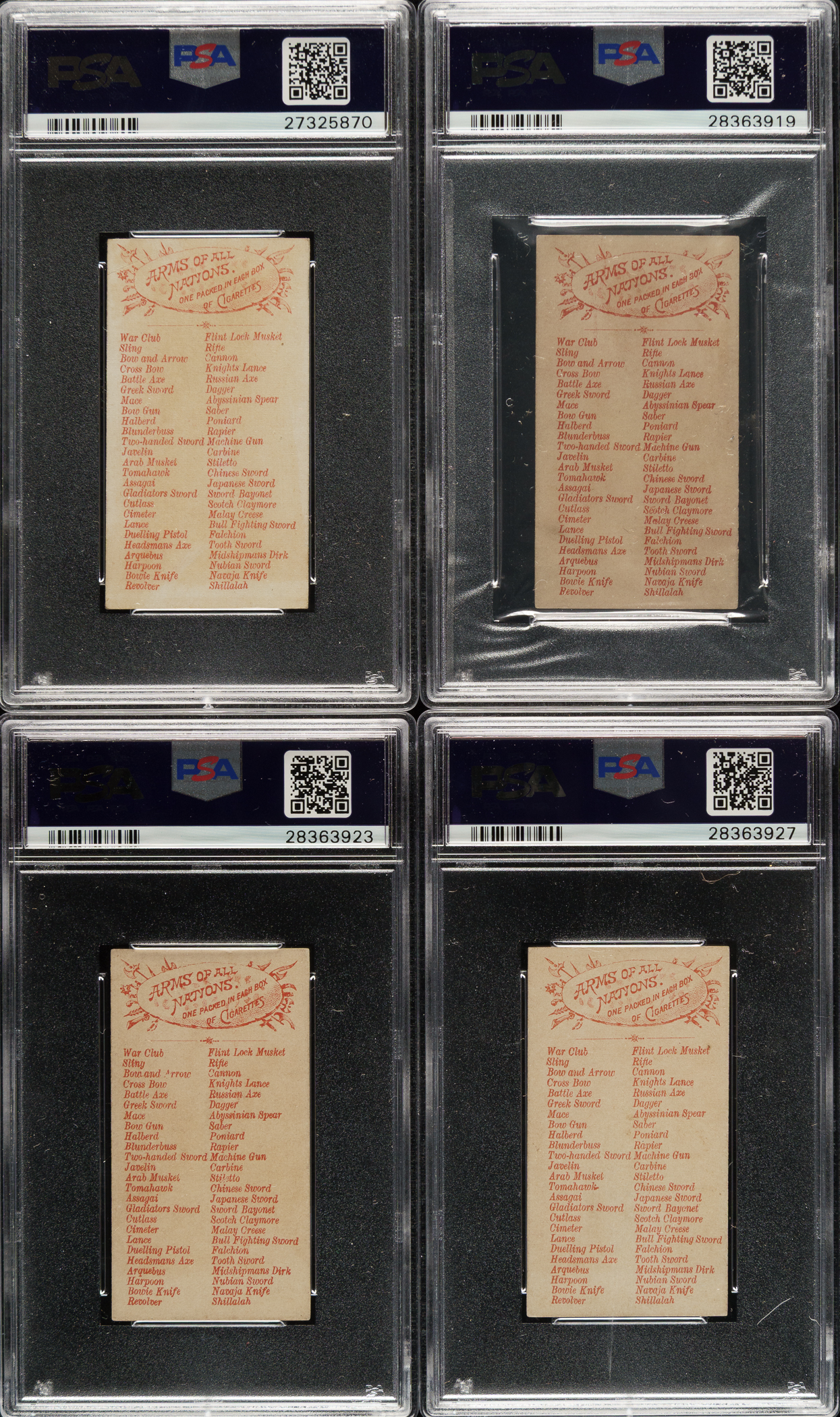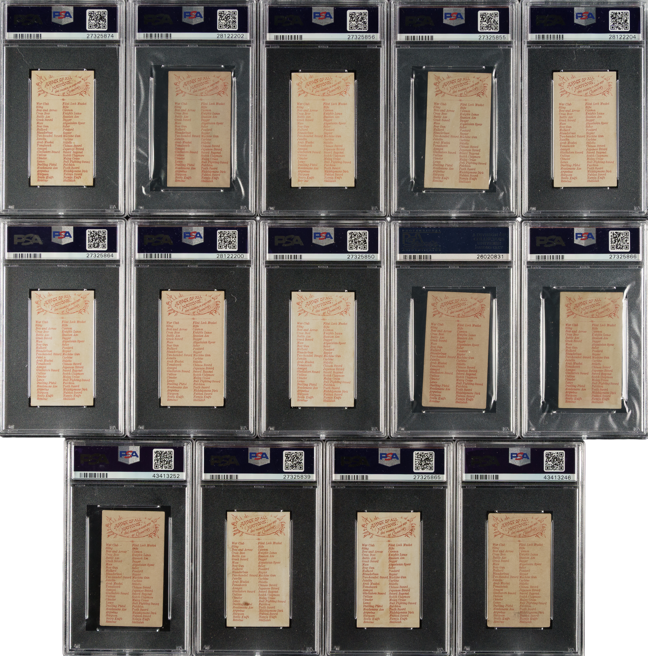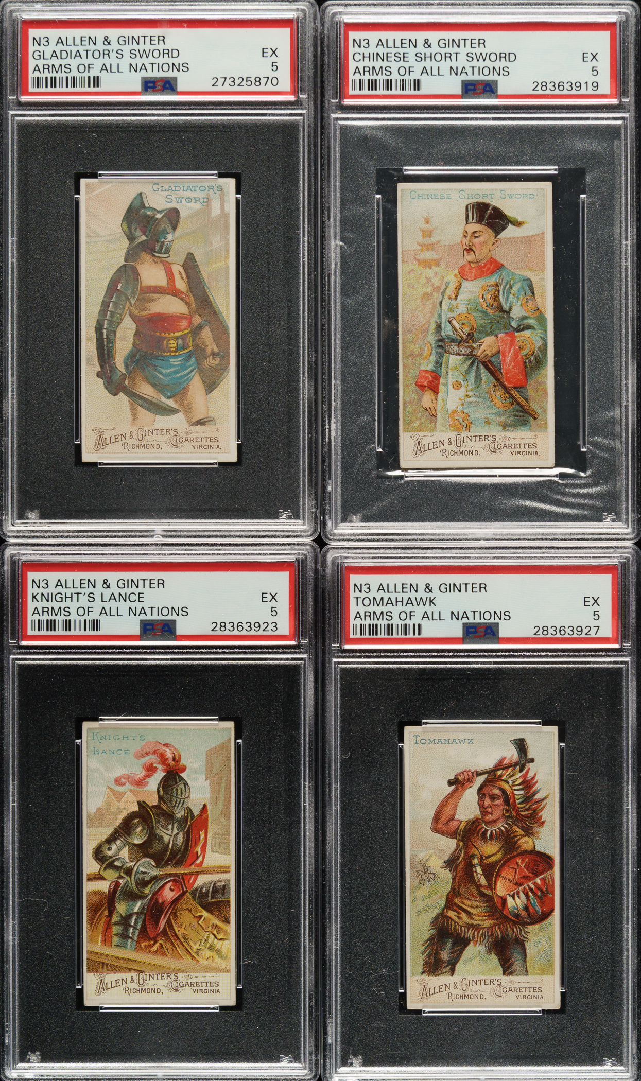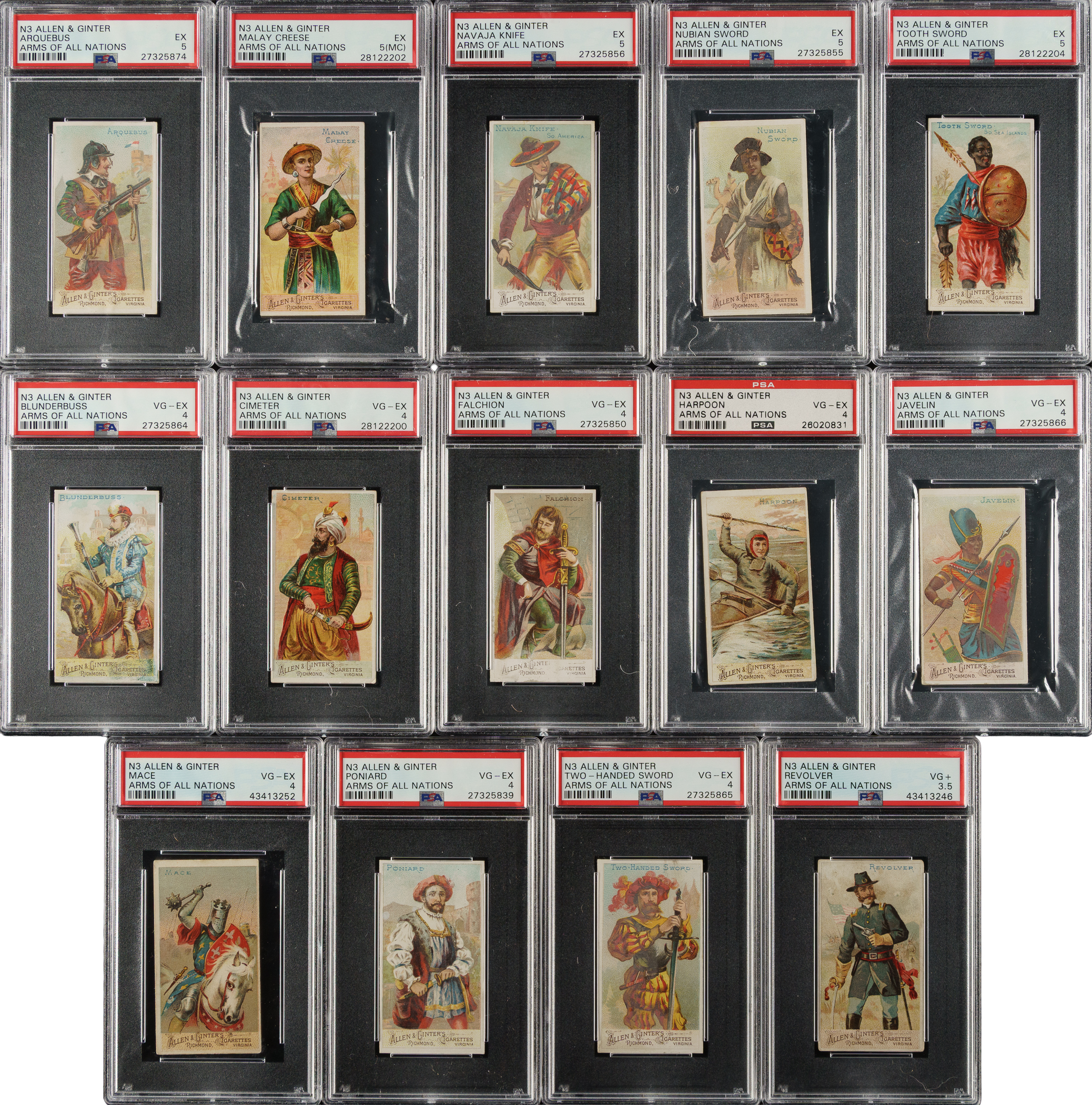 Tremendous collection of eighteen different cards (out of 50 in the set) from the extremely desirable N3 "Arms of All Nations" series issued by Allen & Ginter in 1887, each graded and encapsulated by PSA. This colorful set features men from all around the world holding various weapons. The cards each measure approximately 1-1/2 x 2-3/4 inches, and a checklist for the entire set appears on the reverse. PSA Grading Composite: EX 5 (9 cards): Arquebus, Chinese Short Sword, Gladiator's Sword, Knight's Lance, Malay Creese (MC), Navaja Knife, Nubian Sword, Tomahawk, and Tooth Sword. VG-EX 4 (8 cards): Blunderbuss, Cimeter, Falchion, Harpoon, Javelin, Mace, Poniard, and Two-Handed Sword. VG+ 3.5 (1 card): Revolver. Allen & Ginter's "Arms of All Nations" are rarely offered as a sizeable group and are highly prized by nineteenth-century nonsport tobacco-card collectors. Total: 18 cards. The size/weight of this item requires that there will be an additional shipping charge for this lot.