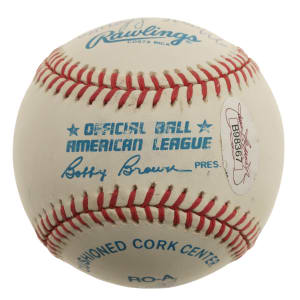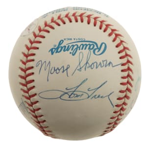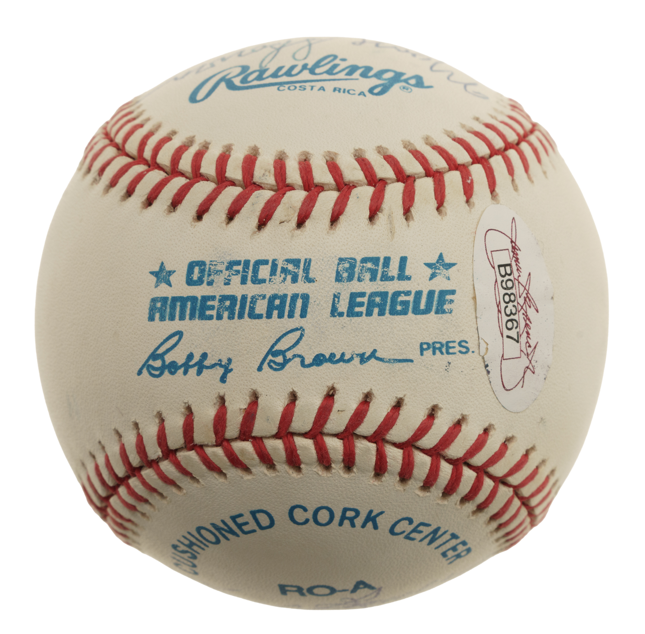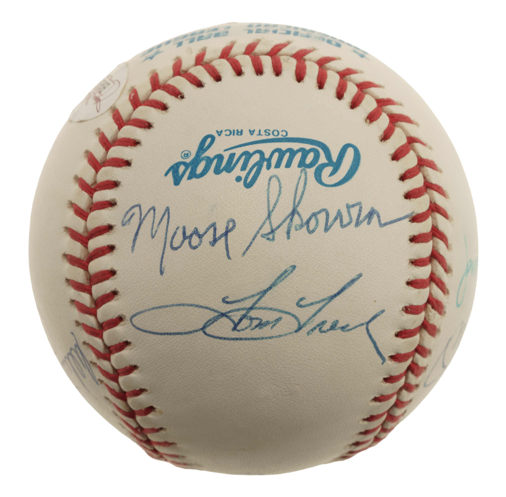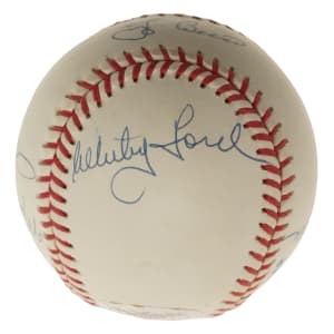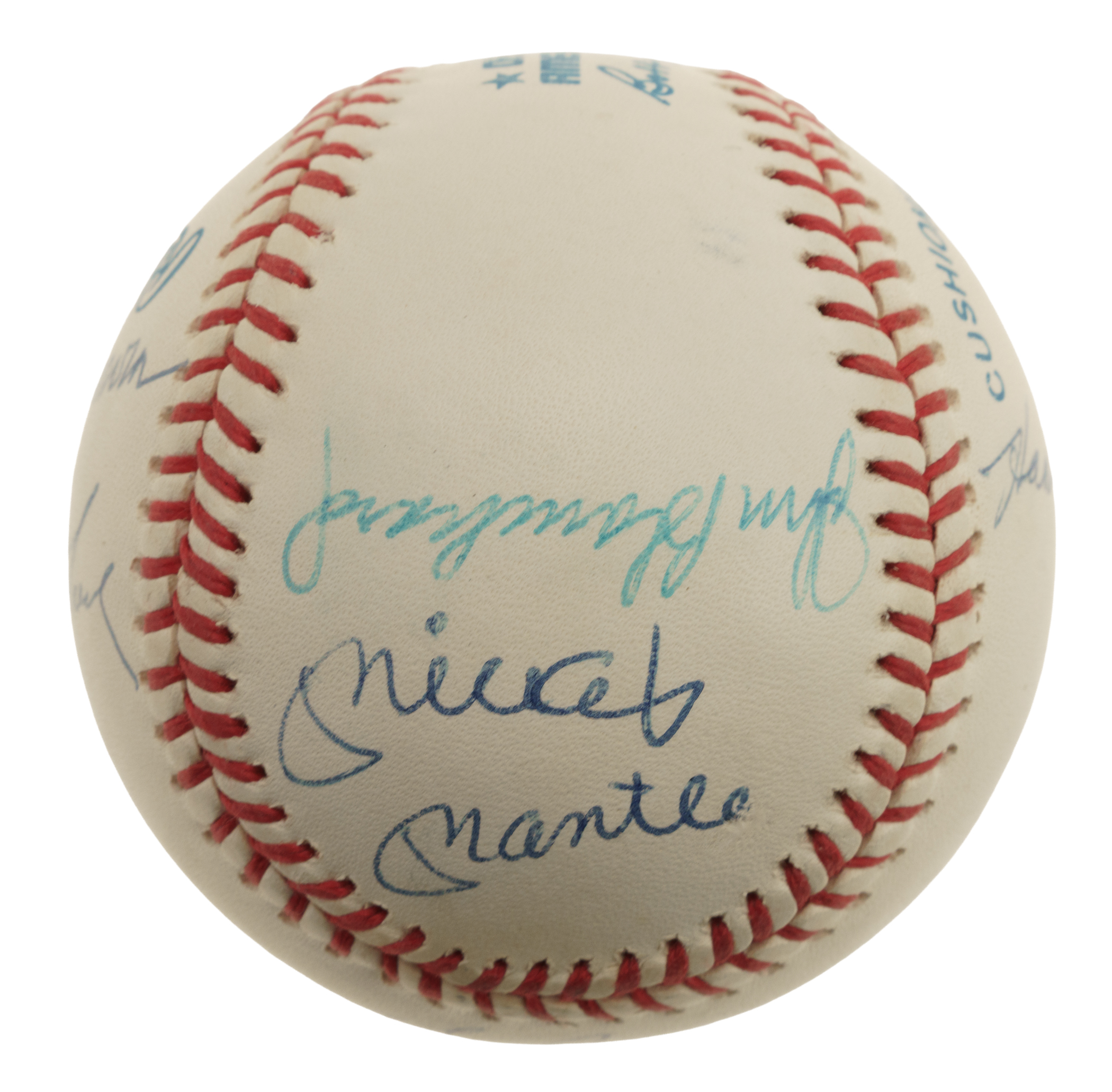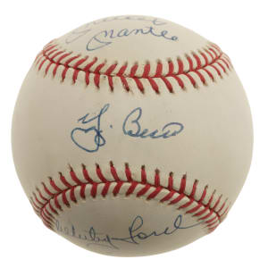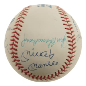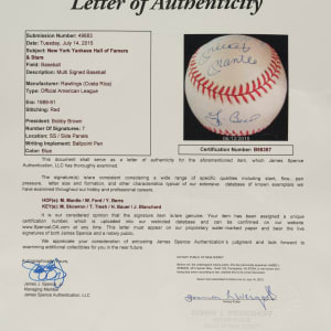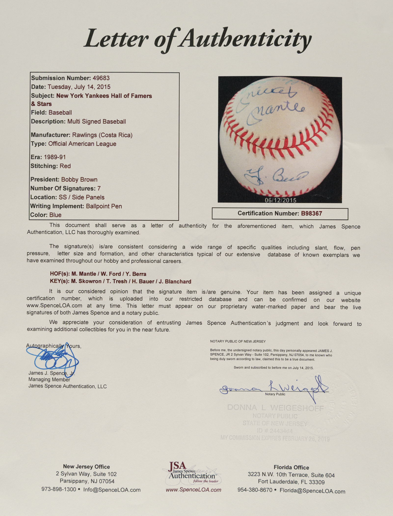 New York Yankees Hall of Fame and Stars multi-signed baseball. Includes the following signatures: Mickey Mantle, Whitey Ford, Yogi Berra, Moose Skowron, Tom Tresh, Hank Bauer and John Blanchard. Total: 7 signatures. Full LOA from James Spence/JSA.