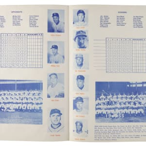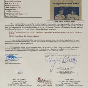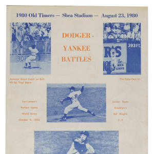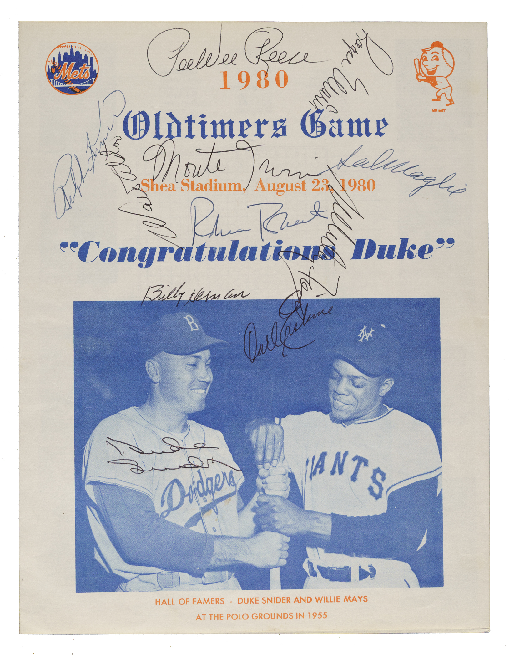 1980 New York Mets "Oldtimers Game" ceremony program signed on the cover by eleven attendees, including Roger Maris, Duke Snider, Pee Wee Reese, Whitey Ford, Billy Herman, Walt Alston, Ralph Kiner, Monte Irvin, Robin Roberts, Carl Erskine, and Sal Maglie. All of the signatures are boldly scripted in either black or blue ink on the front cover. The two-page fold-over program (8-3/8 x 10-7/8 inches), which is not scored, has light handling wear and minor creases. In Very Good to Excellent condition overall. Full LOA from James Spence/JSA.