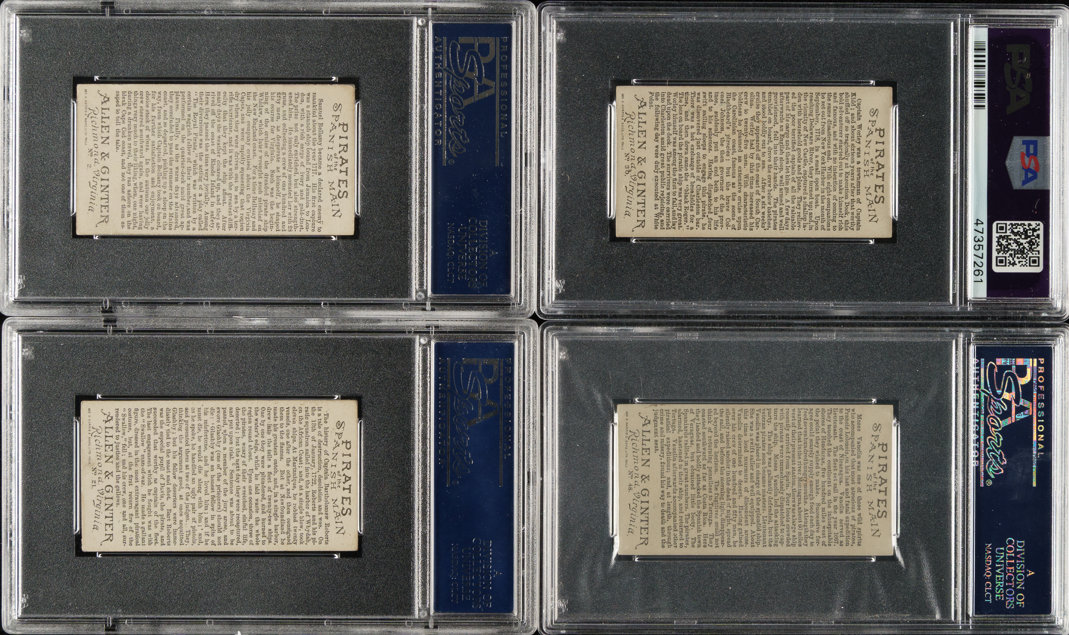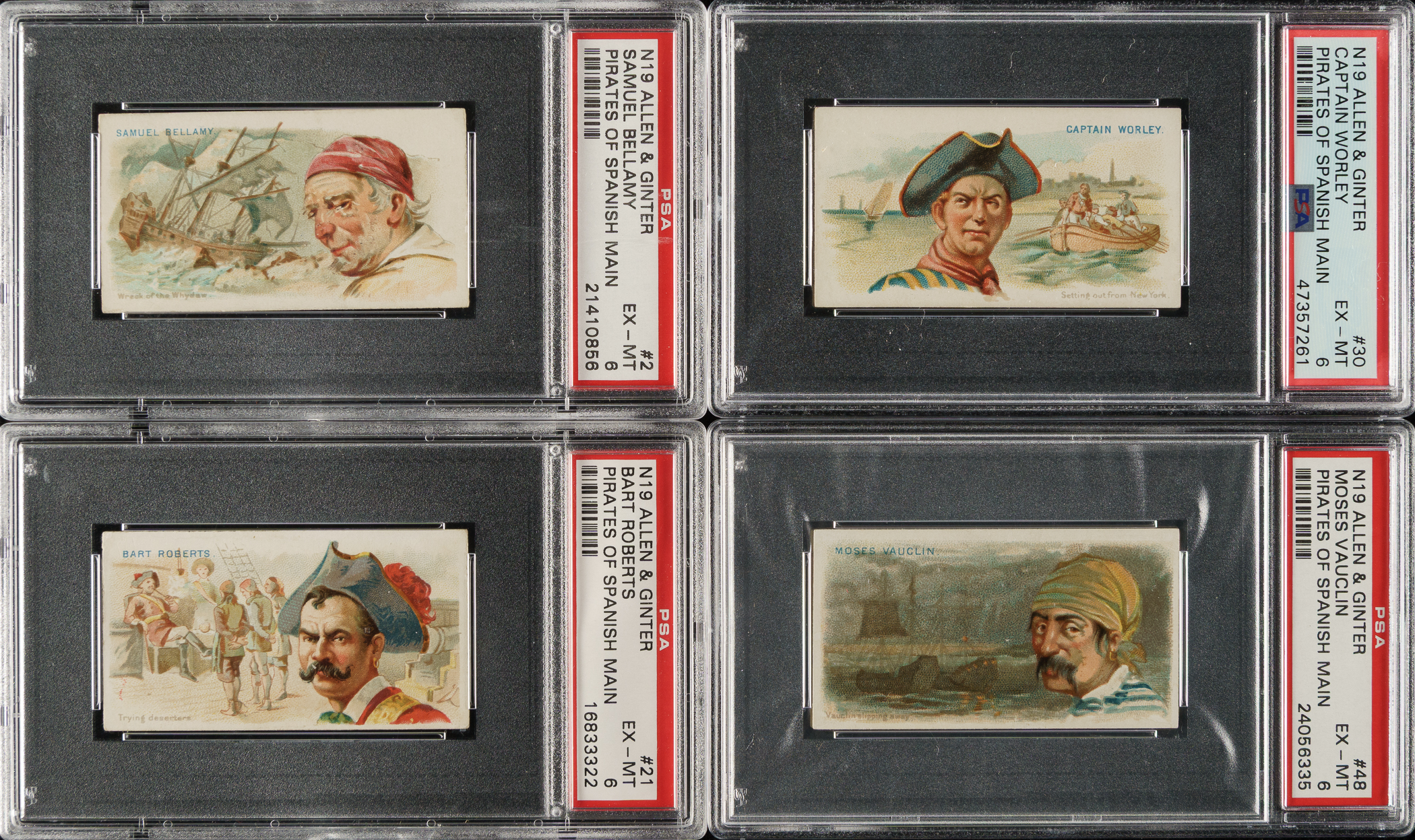 Presented is a collection of four 1888 N19 Allen & Ginter "Pirates of the Spanish Main" trading cards, each professionally graded and encapsulated EX-MT 6 by PSA. This collection consists of the following: #2, 21, 30, and 48. Total: 4 cards.