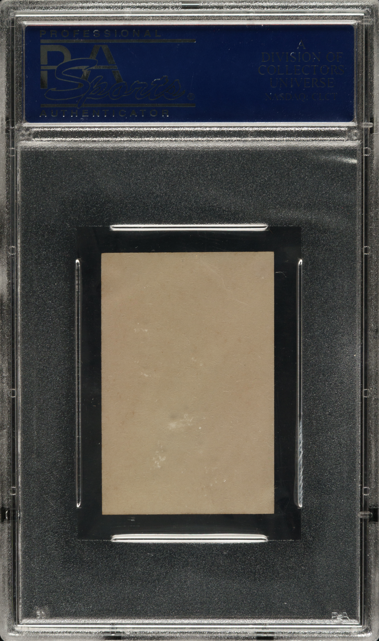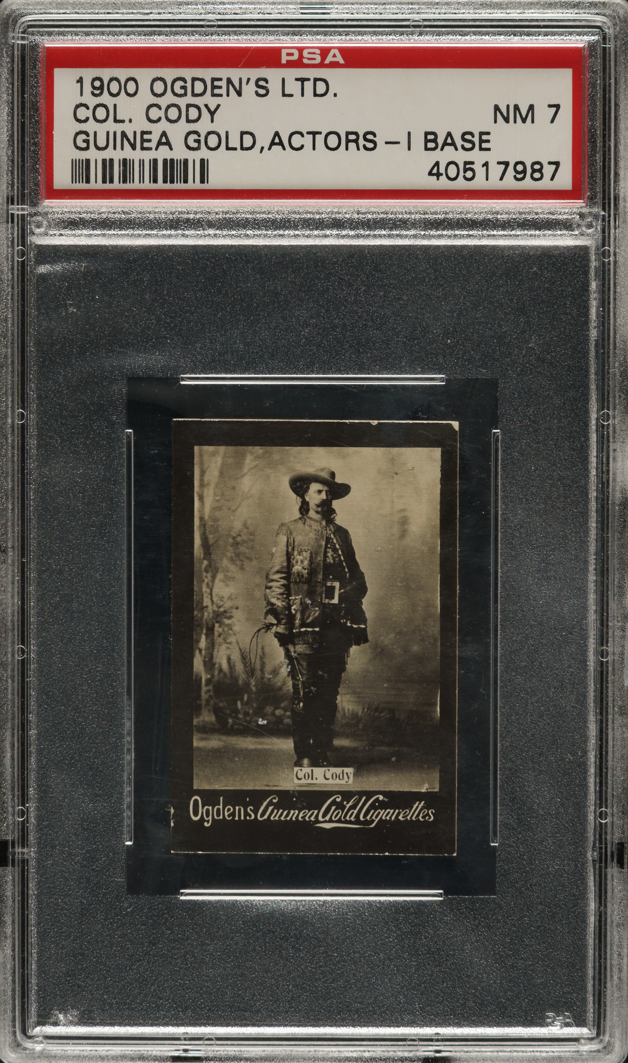 Graded NM 7 by PSA. One of only six examples graded at this level with none higher! Rare type card from the 1900 Ogden's Guinea Gold set featuring legendary showman Buffalo Bill. The Ogden's Guinea Gold cards are considered by many serious collectors to be among the most difficult of all vintage issues to collect in high grade. Their black border design makes these cards extremely susceptible to damage. This card is in spectacular condition for the issue! Crisp and clean, with strong corners, and excellent centering. The blank reverse is clean. This is a very attractive high-grade example featuring one of the most celebrated figures of the day from this turn-of-the-century issue.