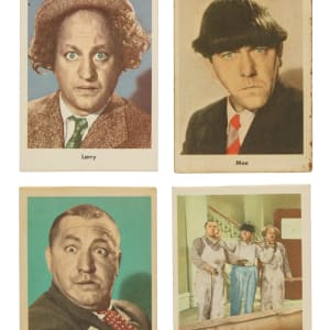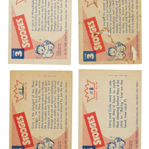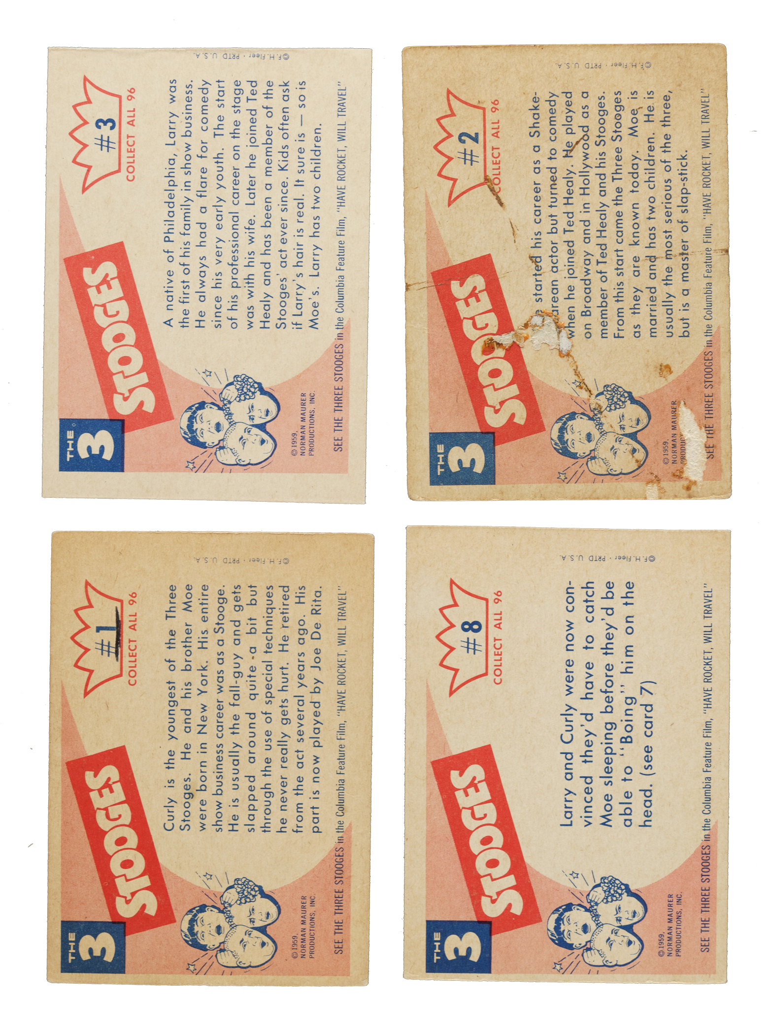 Complete set of this classic nonsport issue. Fleer's 1959 "Three Stooges" set is recognized as one of the most popular nonsport issues of the era. This set was issued when the Stooges' movie shorts were being introduced on television for the first time to a new generation of youngsters. The exposure revitalized their careers, giving them a second chance to entertain millions. This second shot of stardom resulted in even greater popularity than they had experienced in the 1930s and 1940s and ingrained the Stooges' comedy into the consciousness of America and popular culture. Naturally, many products were produced to capitalize on this stardom, including this set of bubble-gum cards. Their shorts, which were originally produced to be shown as bonuses with feature films at movie theaters, are still shown on television today, ensuring a legion of new fans in each generation and promoting the Stooges' status as American icons of comedy. Condition is 10% Ex to Ex-Mt, 54% Vg to Vg-Ex, and 36% lesser (including two trimmed). Keys: #1 Curly (pen mark on reverse, otherwise Vg), 2 Moe (Pr), and 3 Larry (100/0 T/B, otherwise Vg-Ex+). This is an attractive medium- to lower-grade complete set of this classic 1950s nonsport issue. Total: 96 cards.