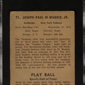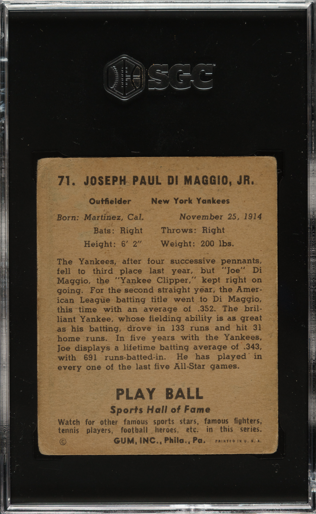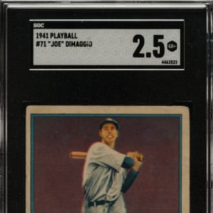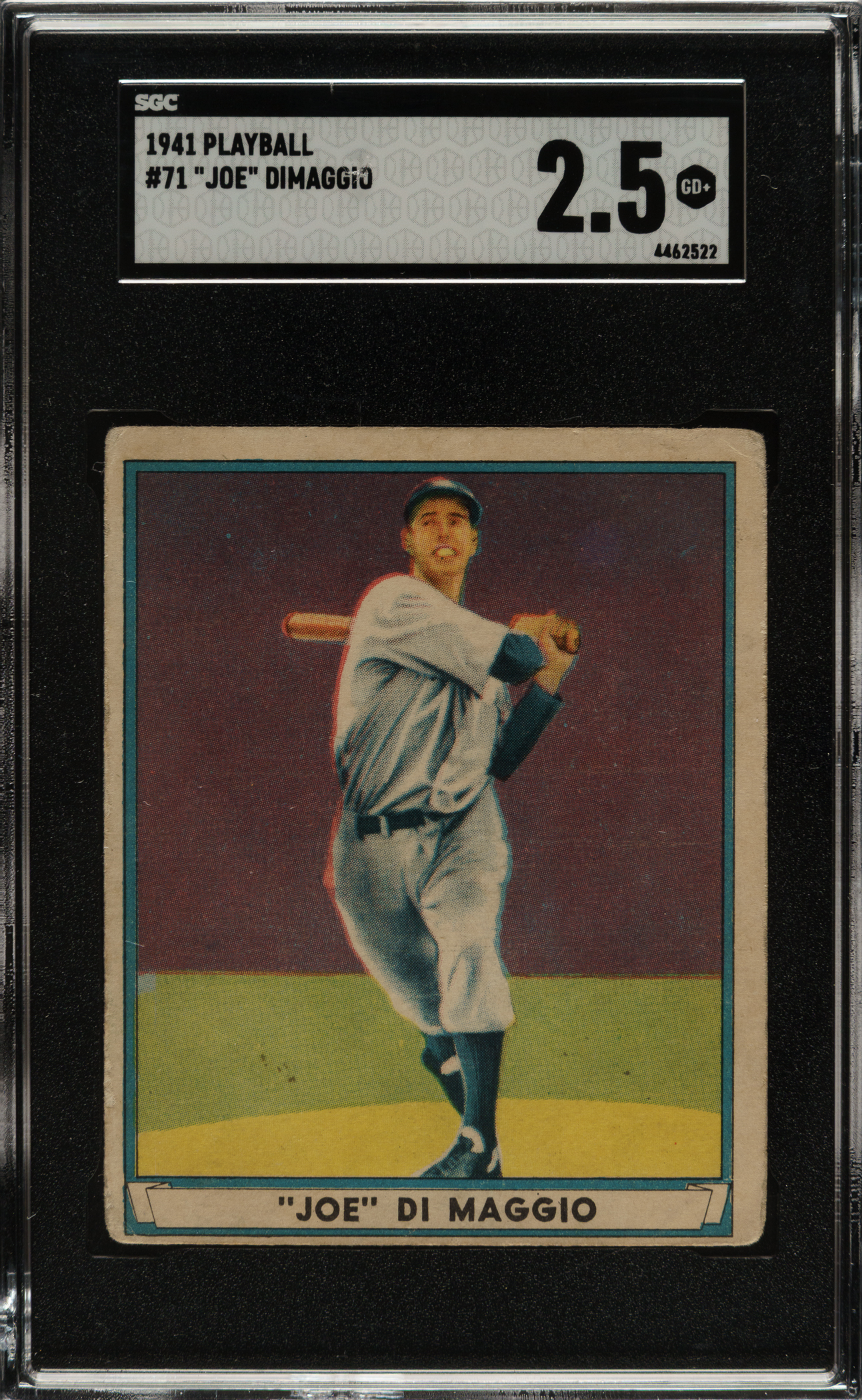Graded GOOD+ 2.5 by SGC. Visually appealing 1941 Play Ball of New York Yankees Hall of Famer Joe DiMaggio. This example has bold colors, outstanding registration, and honest corner wear. The reverse displays bold black text. This card tends to be very difficult to find in high grade because it is #71 of 72 cards in the set. A very pleasing example of one of the key cards from the 1941 Play Ball set and one of the iconic cards of the era.