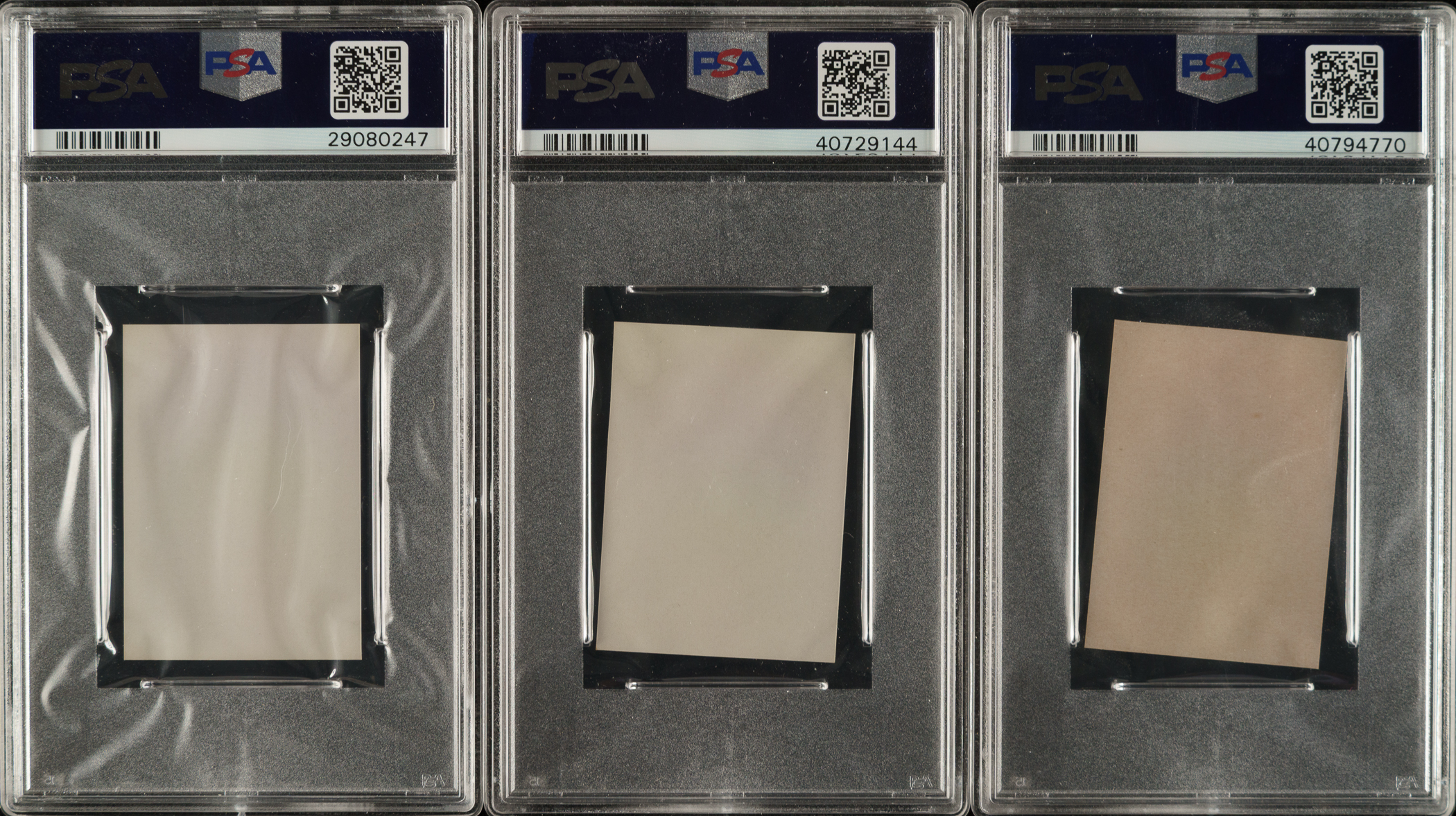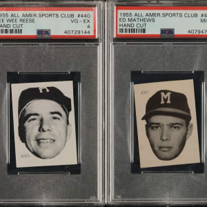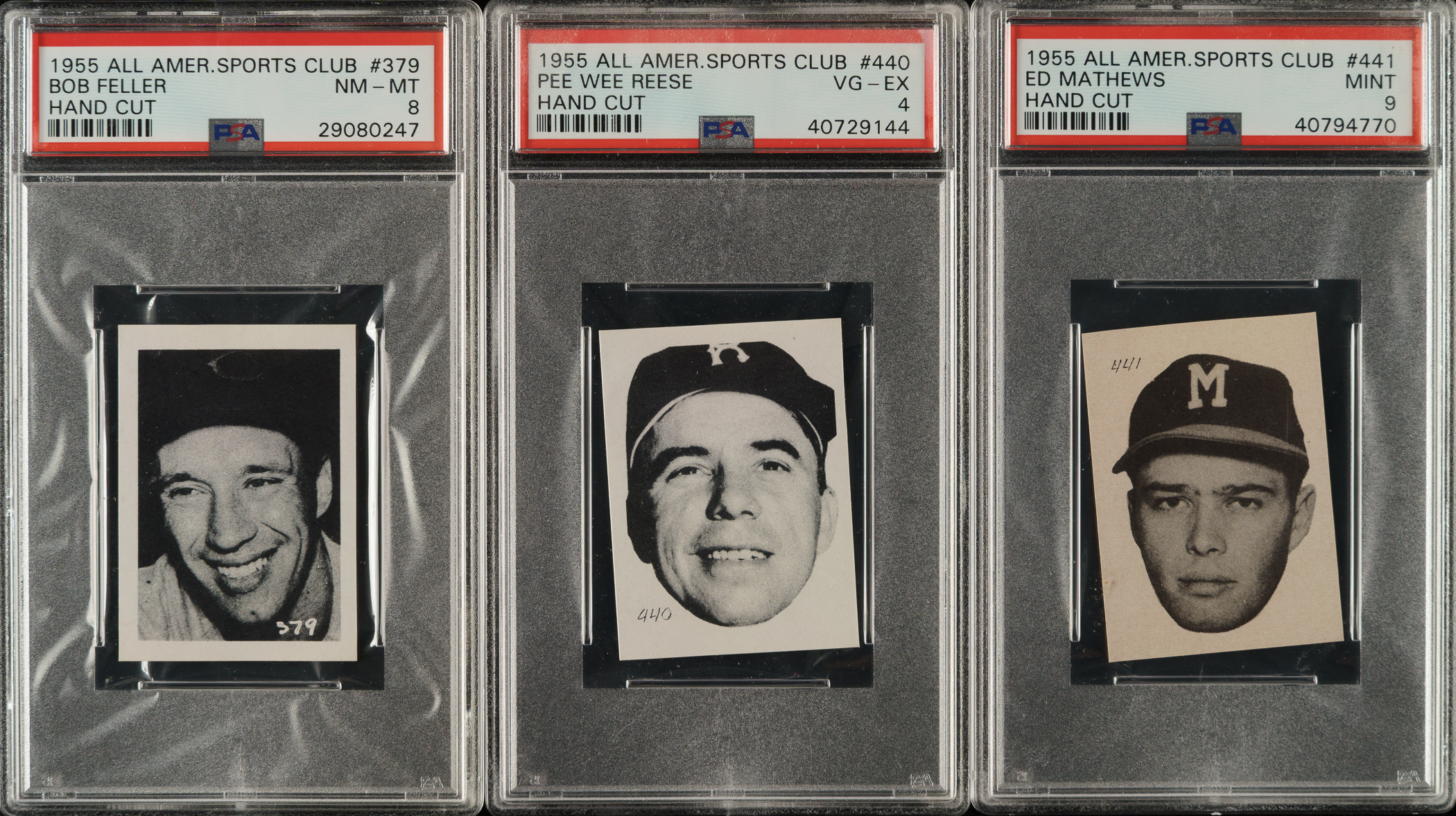 Trio of 1955 All American Sports Club cards, each graded and encapsulated by PSA. This trio consists of the following: #379 Feller (NM-MT 8), 440 Reese (VG-EX 4) and 441 Mathews (MINT 9). Total: 3 cards.