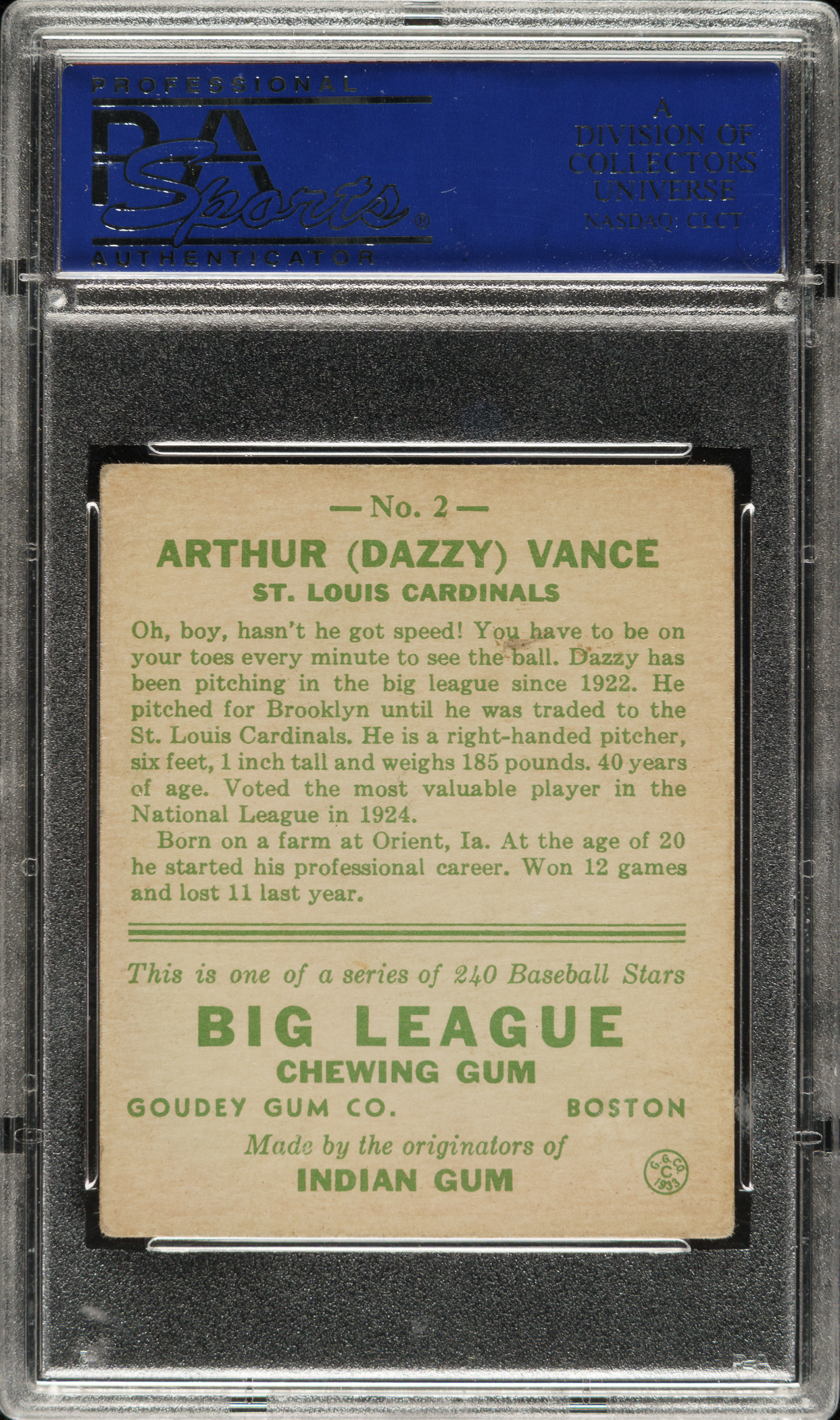 Graded EX 5 by PSA. St. Louis Cardinals Hall of Famer Dazzy Vance.