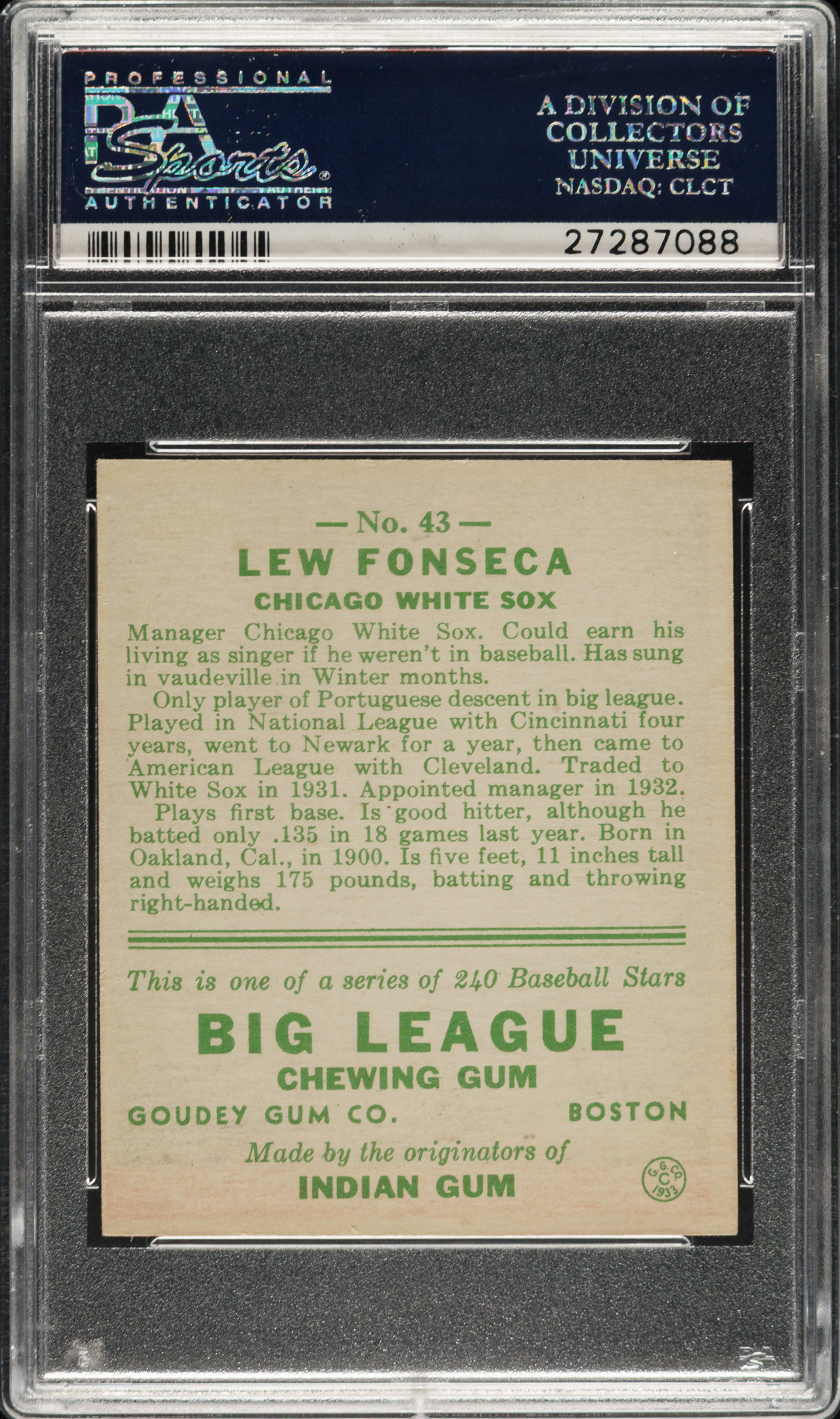 Lot # 728: 1933 R319 Goudey #43 Lew Fonseca PSA NM 7