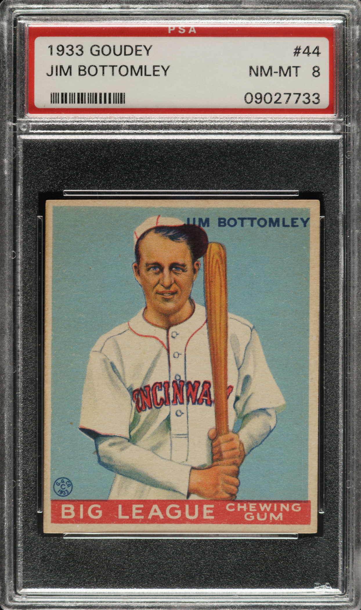 Graded NM-MT 8 by PSA. Highest-graded example! Superb high-grade example of Cincinnati Reds Hall of Famer Jim Bottomley (#44) from the 1933 Goudey set. The offered card boasts brilliant colors, outstanding registration, clean off-white borders, and strong corners. Clean reverse with bold green text. A tremendous high-grade example worthy of any world-class 1933 Goudey set or Hall of Fame collection.