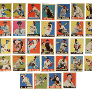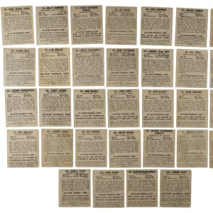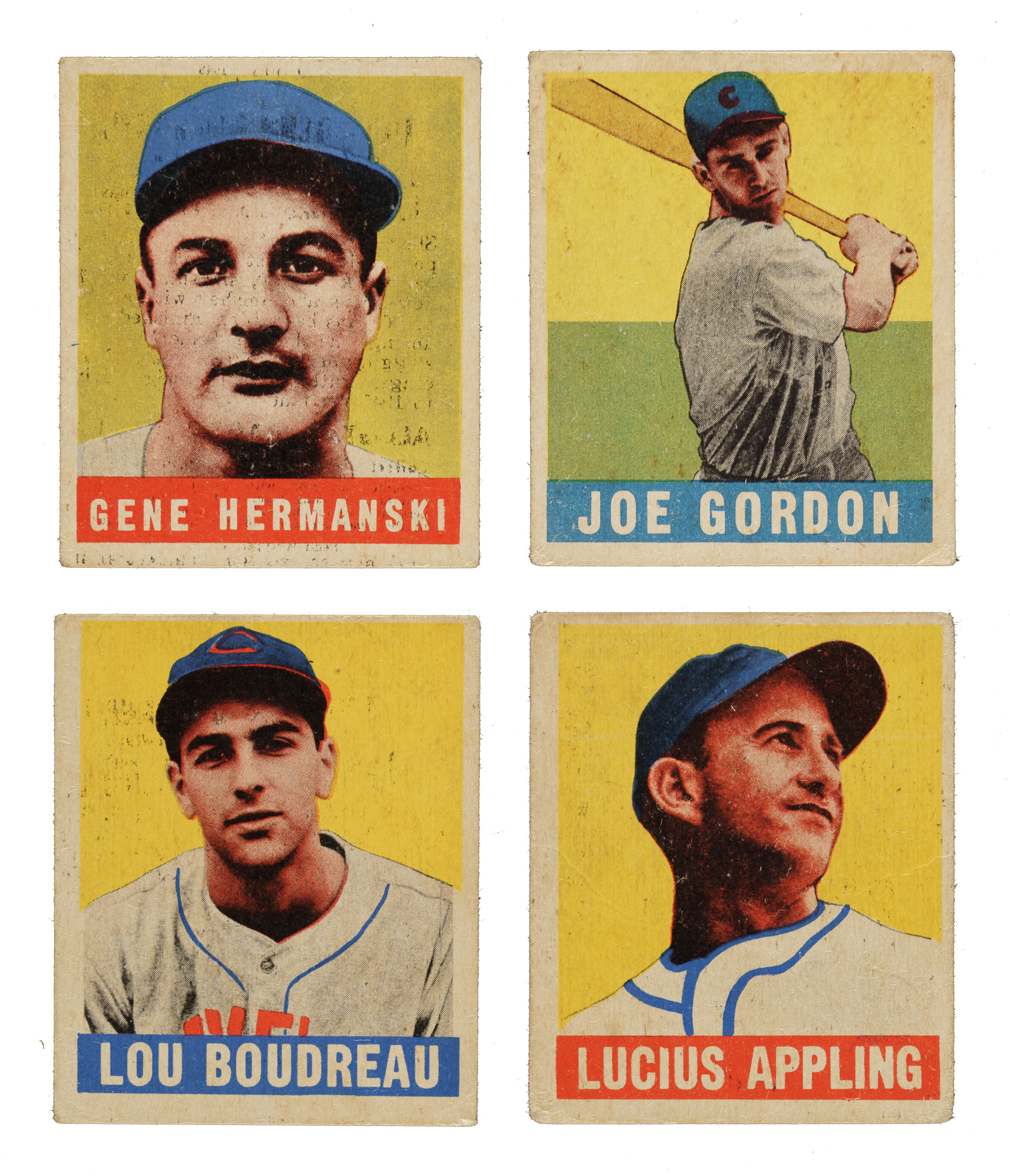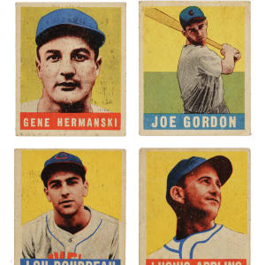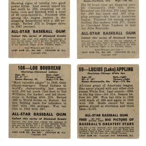 Presented is a collection of thirty-seven different 1948-1949 Leaf Gum cards highlighted by Hall of Famers, Luke Appling, Lou Boudreau, and Joe Gordon. Condition is Gd to Vg overall, with two Vg-Ex and two lesser. This collection consists of the following: #10, 14, 17, 22, 26, 27, 28, 29, 31, 39 Blackwell, 42a/black cap, 47, 49, 50, 53 Vander Meer, 56, 57, 59 Appling (Gd, HOF), 61, 65, 72, 73, 77, 82, 84, 86, 95, 97 Marion RC, 102b Hermanski/spelled correctly (Vg+), 106 Boudreau (Vg+), 111, 117 Gordon (Vg, HOF), 125, 128, 136a Aberson/full sleeve (Vg), 139, and 159. This is a very attractive and consistent medium-grade collection highlighted by three Hall of Famers. Total: 37 cards.