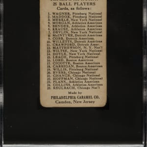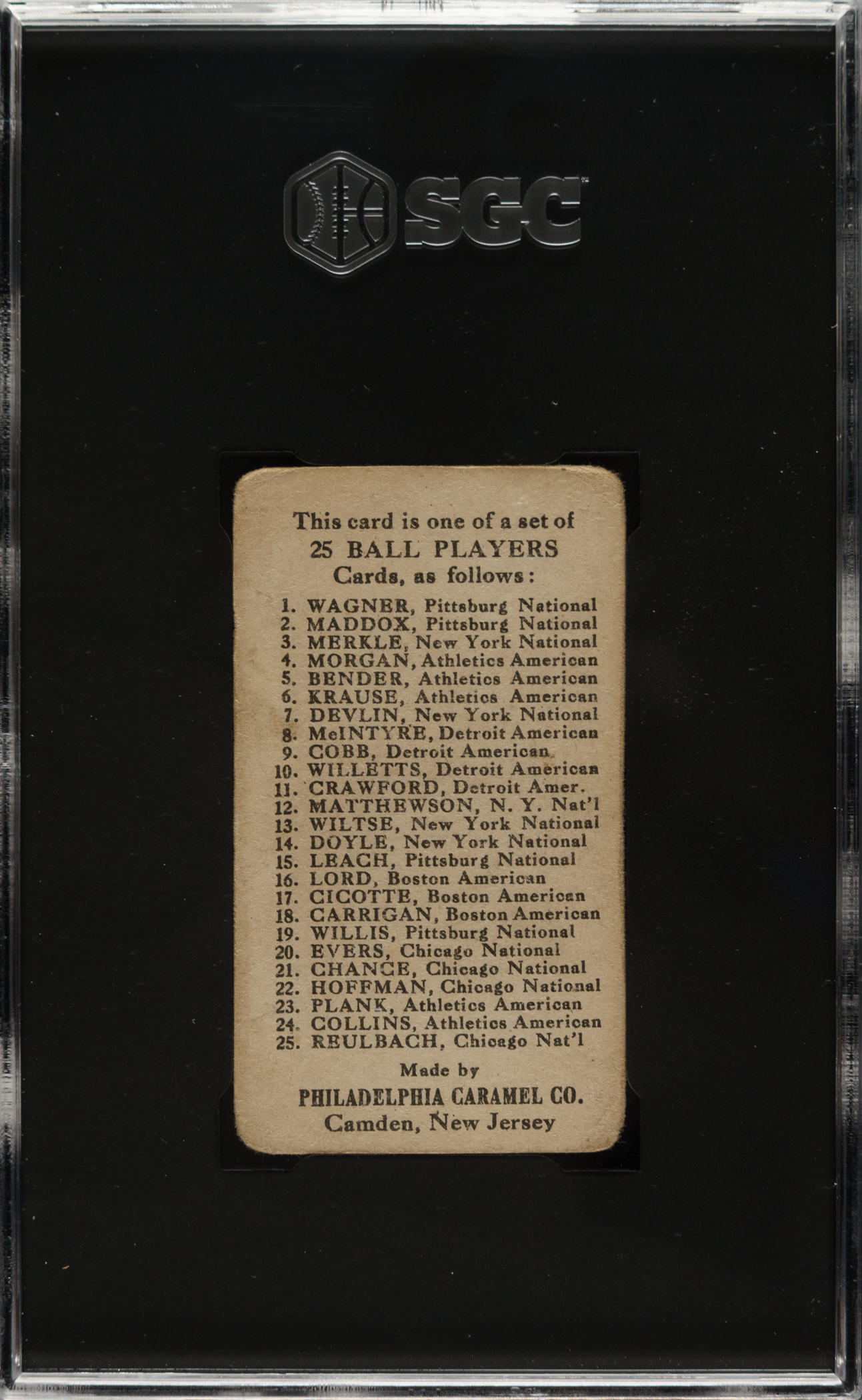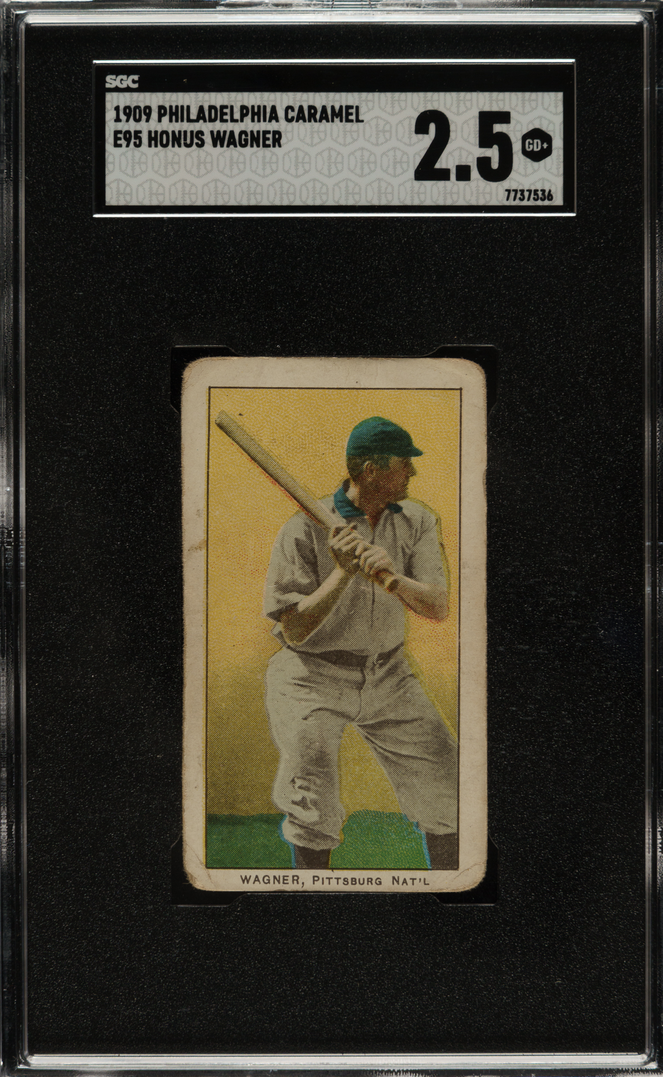 Graded GOOD+ 2.5 by SGC. Hall of Famer Honus Wagner in a batting pose from the E95 Philadelphia Caramel series, one of Wagner's most beautifully designed cards and one of the key cards from this rare and classic 1910-era candy set. The image on this card is unique to the set. The offered card has bright colors, outstanding registration, and rounded corners. The reverse is boldly printed and clean. There is light creasing around all four corners. The E95 Philadelphia Caramel card of Honus Wagner is one of his most highly prized cards in any grade. This is an appealing example of one of Wagner’s most desirable cards from one of the most popular and colorful of all “E” card issues.