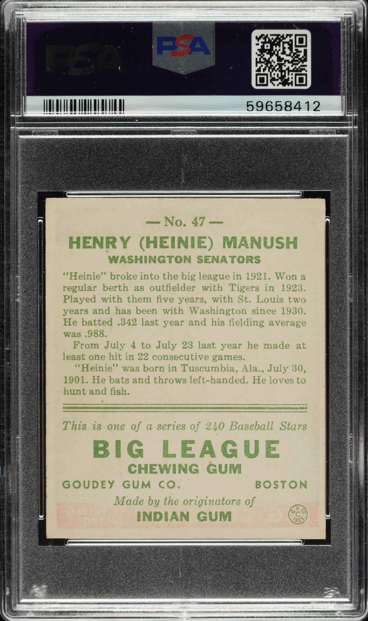 Graded NM-MT 8 by PSA. Highest-graded example! Exceptional high-grade example of Washington Senators Hall of Famer Heinie Manush (#47) from the 1933 Goudey set. The offered card boasts brilliant colors, impressive registration, clean off-white borders, and strong corners. Clean reverse with bold green text. A stunning high-grade example worthy of any world-class 1933 Goudey set or Hall of Fame collection.