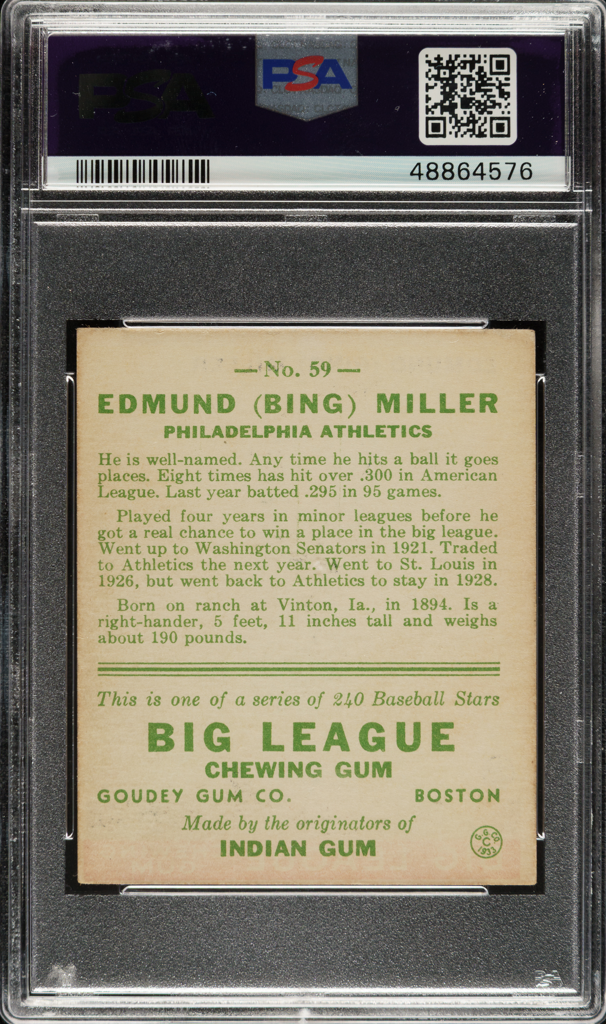 Graded EX-MT 6 by PSA. Philadelphia Athletics.