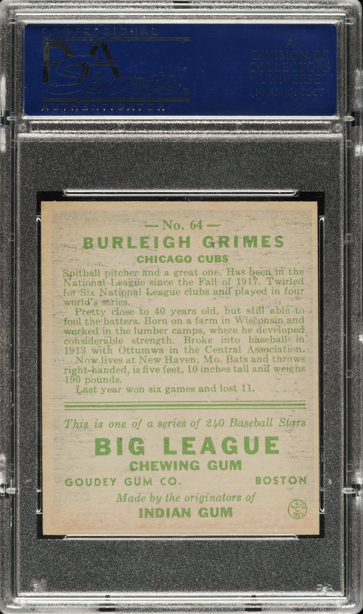 Graded NM 7 by PSA. Chicago Cubs Hall of Famer Burleigh Grimes.