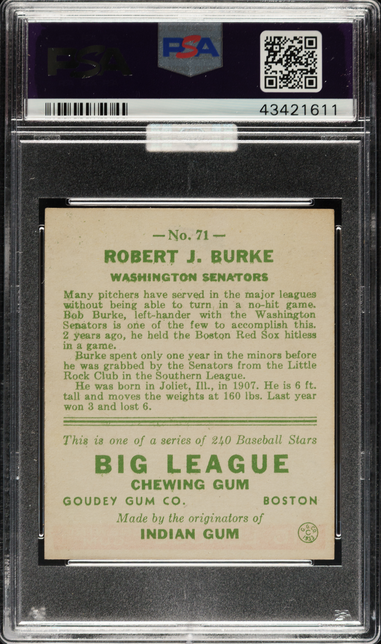Graded EX-MT 6 by PSA. Washington Senators. Awarded an MBA Silver Diamond by Mike Baker Authenticated for high-end eye appeal. A corresponding MBA sticker is affixed to the front of the holder.