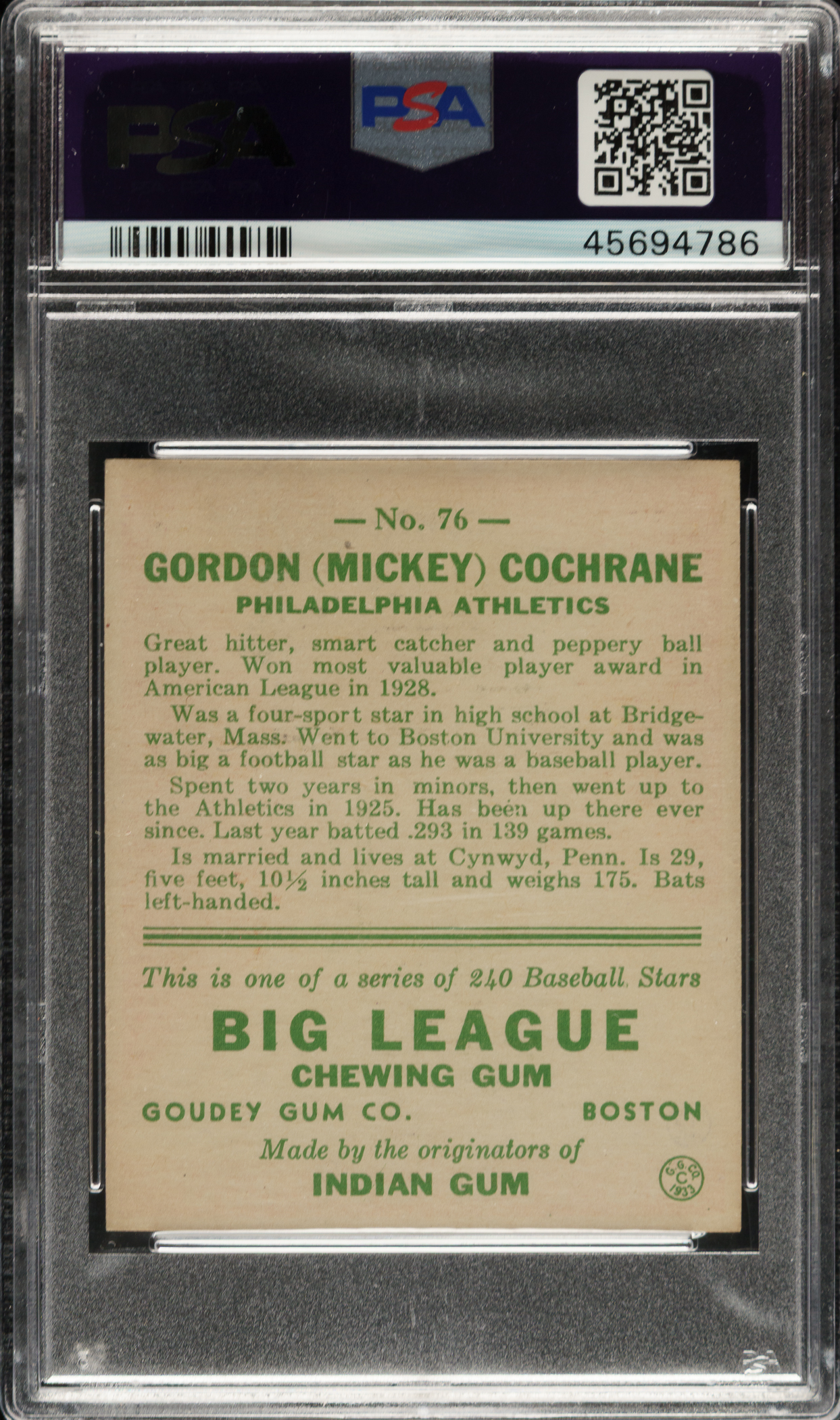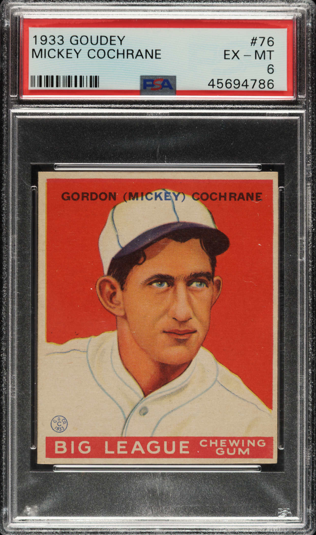 Graded EX-MT 6 by PSA. Philadelphia Athletics Hall of Famer Mickey Cochrane.