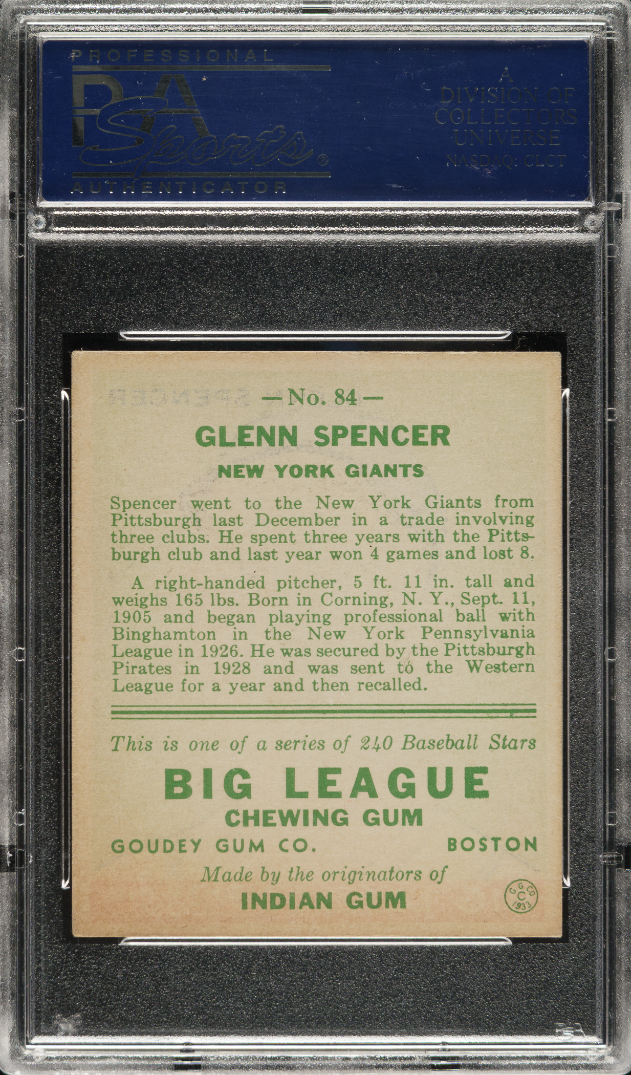 Lot # 773: 1933 R319 Goudey #84 Glenn Spencer PSA EX-MT 6
