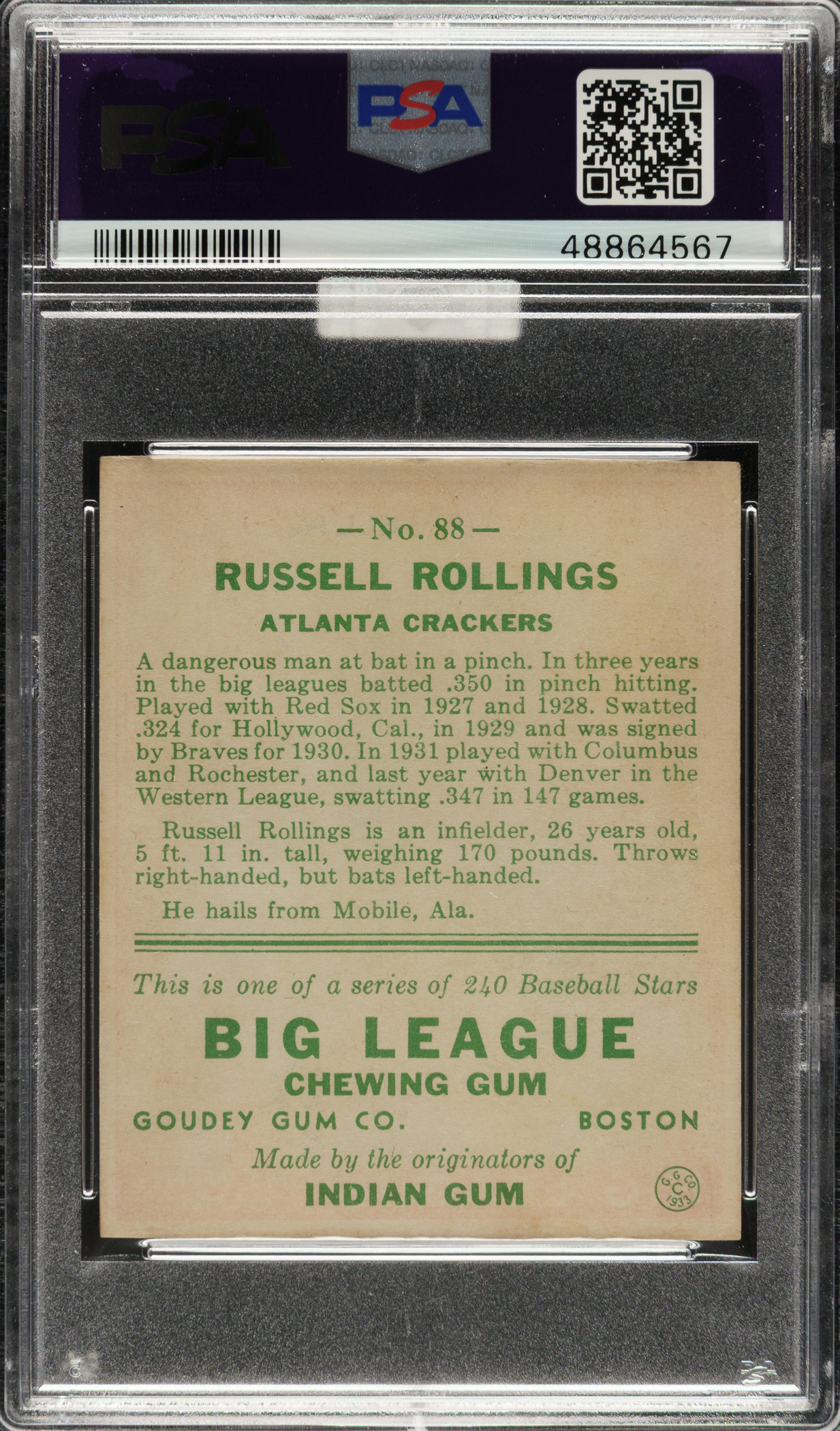 Graded EX-MT 6 by PSA. Atlanta Crackers. Awarded an MBA Gold Diamond by Mike Baker Authenticated for high-end eye appeal. A corresponding MBA sticker is affixed to the front of the holder.