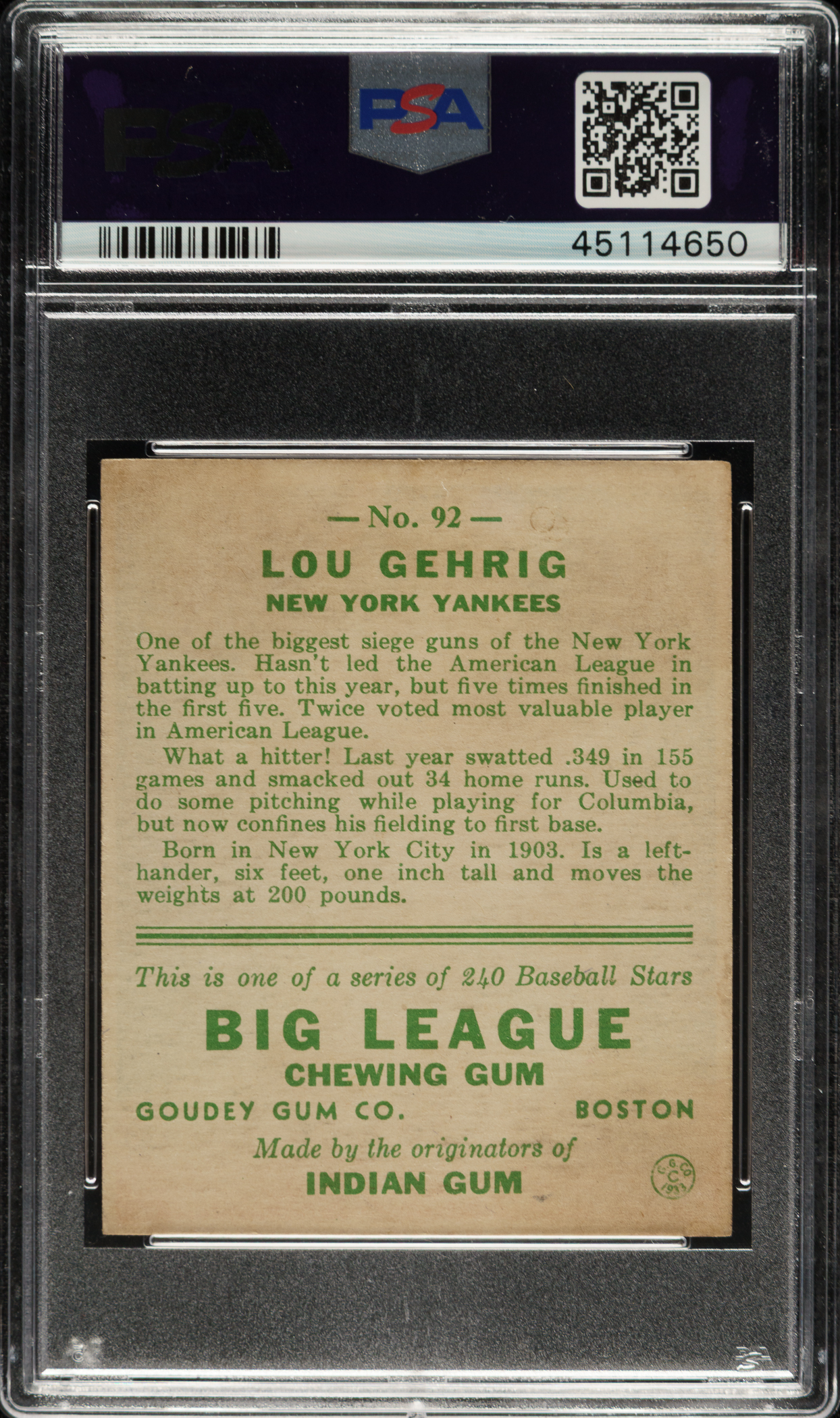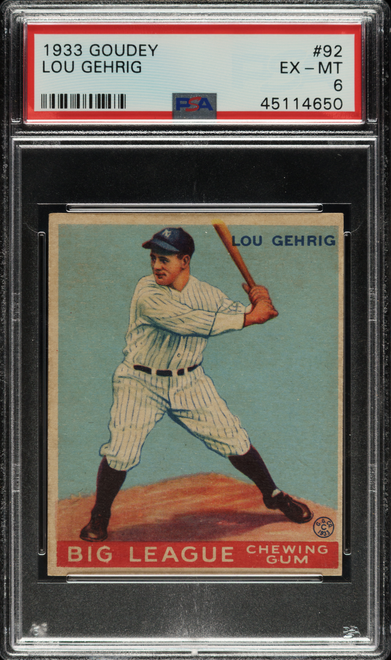 Graded EX-MT 6 by PSA. Very attractive example of one of the most popular of all Lou Gehrig cards and one of the classic 1930s bubble-gum cards. This card has vibrant colors, a crisp image, and strong corners. Clean reverse with bold green text. Lightly toned front and back. This is an ideal card for the collector who wants a beautiful 1933 Goudey #92 Lou Gehrig but is not interested in spending the many additional thousands of dollars an example in a significantly higher grade might run.
