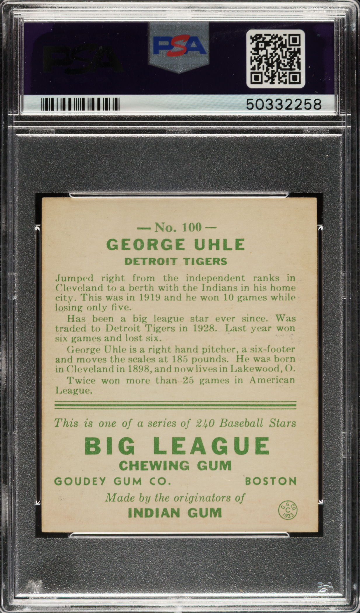 Lot # 792: 1933 R319 Goudey #100 George Uhle PSA NM 7
