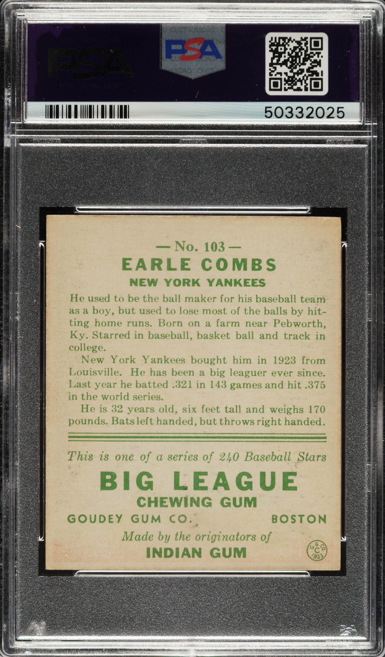 Graded EX-MT 6 by PSA. New York Yankees Hall of Famer Earle Combs.