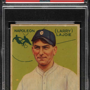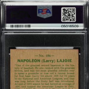 Graded EX 5 by PSA. Tremendous mid-grade example of #106 Napoleon Lajoie from the classic 1933 Goudey set. This is an extremely desirable example of this legendary rarity. This card has a striking green background, outstanding registration, light, honest wear to the corners, two tiny spots of paper loss along the top border, and just a few scattered pinpoint age spots (common to this card). The reverse has natural toning and bold green text. The 1933 Goudey #106 Lajoie, of course, was not actually printed until 1934. When the 1933 set was issued, no #106 card was produced. #106 Lajoie was printed in 1934 and was available only by mail to those few dedicated collectors who took the time to write to Goudey to complain that they could not find #106 to complete their 1933 Goudey sets. The 1933 Goudey set is universally recognized as the most important of all 1930s gum-card issues. #106 Lajoie is the most significant and valuable of all 1930s cards and is widely regarded as one of the three most important of all baseball cards (the others being the famous T206 Wagner and Plank). This is an outstanding example in an extremely desirable grade that would be a worthy addition to any high-quality 1933 Goudey complete set or world-class collection of important cards.