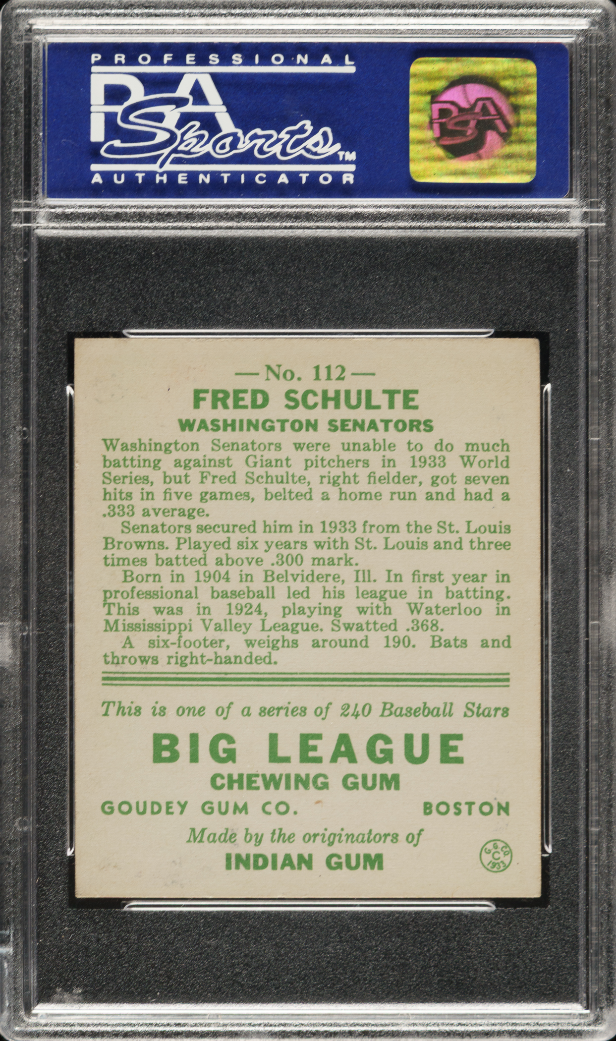 Lot # 804: 1933 R319 Goudey #112 Fred Schulte PSA NM 7