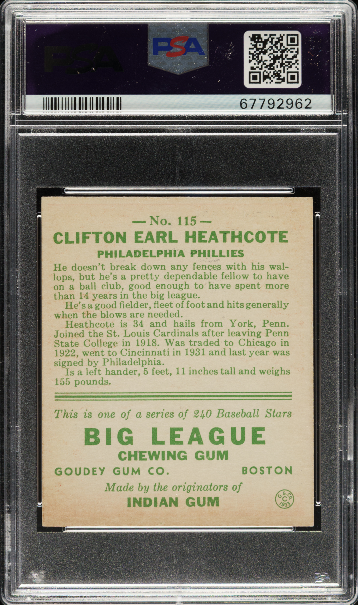 Lot # 807: 1933 R319 Goudey #115 Cliff Heathcote PSA EX-MT 6