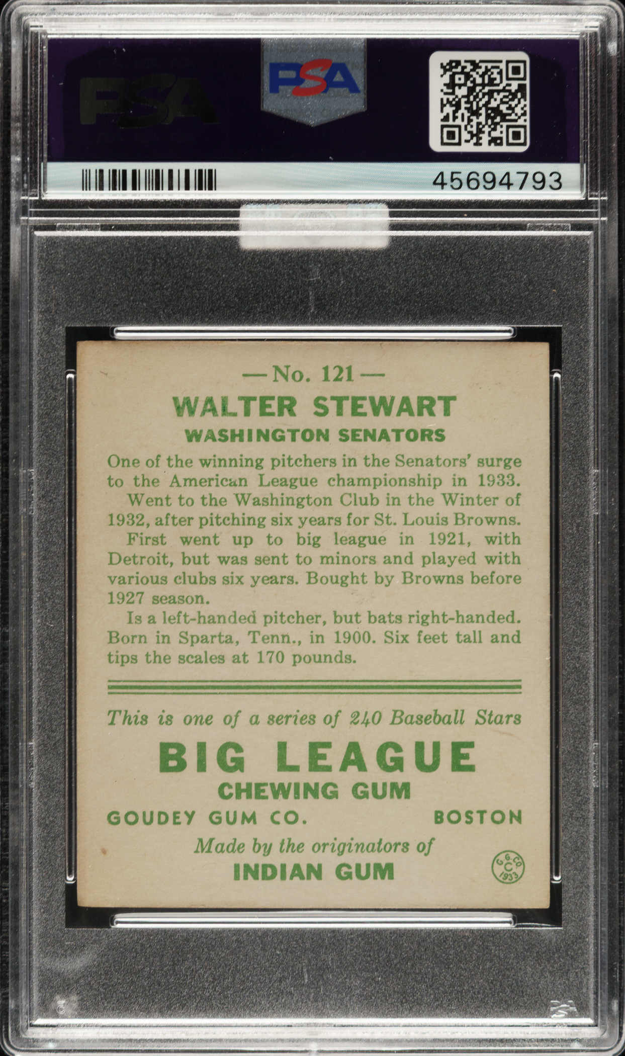Graded NM 7 by PSA. Washington Senators. Awarded an MBA Silver Diamond by Mike Baker Authenticated for high-end eye appeal. A corresponding MBA sticker is affixed to the front of the holder.