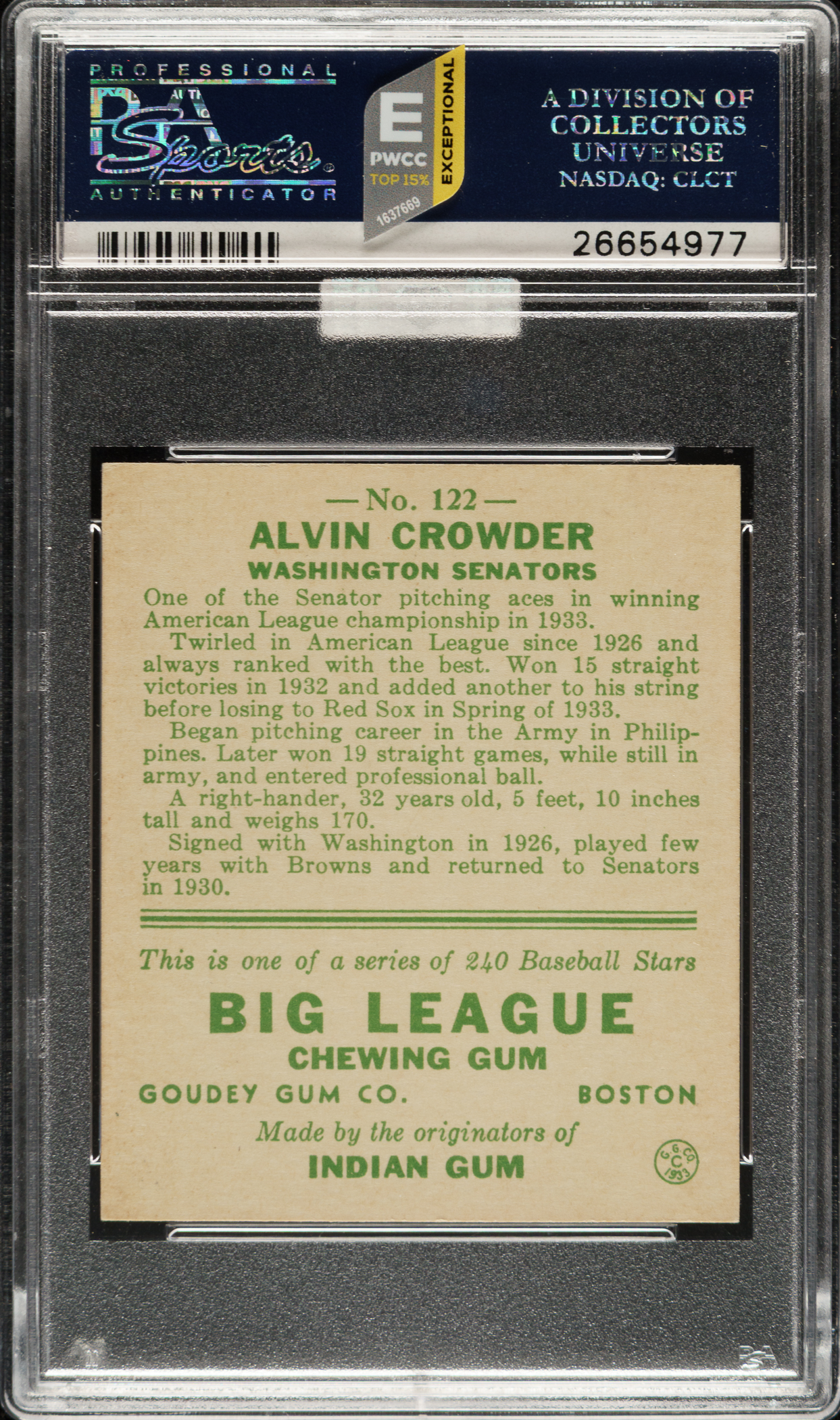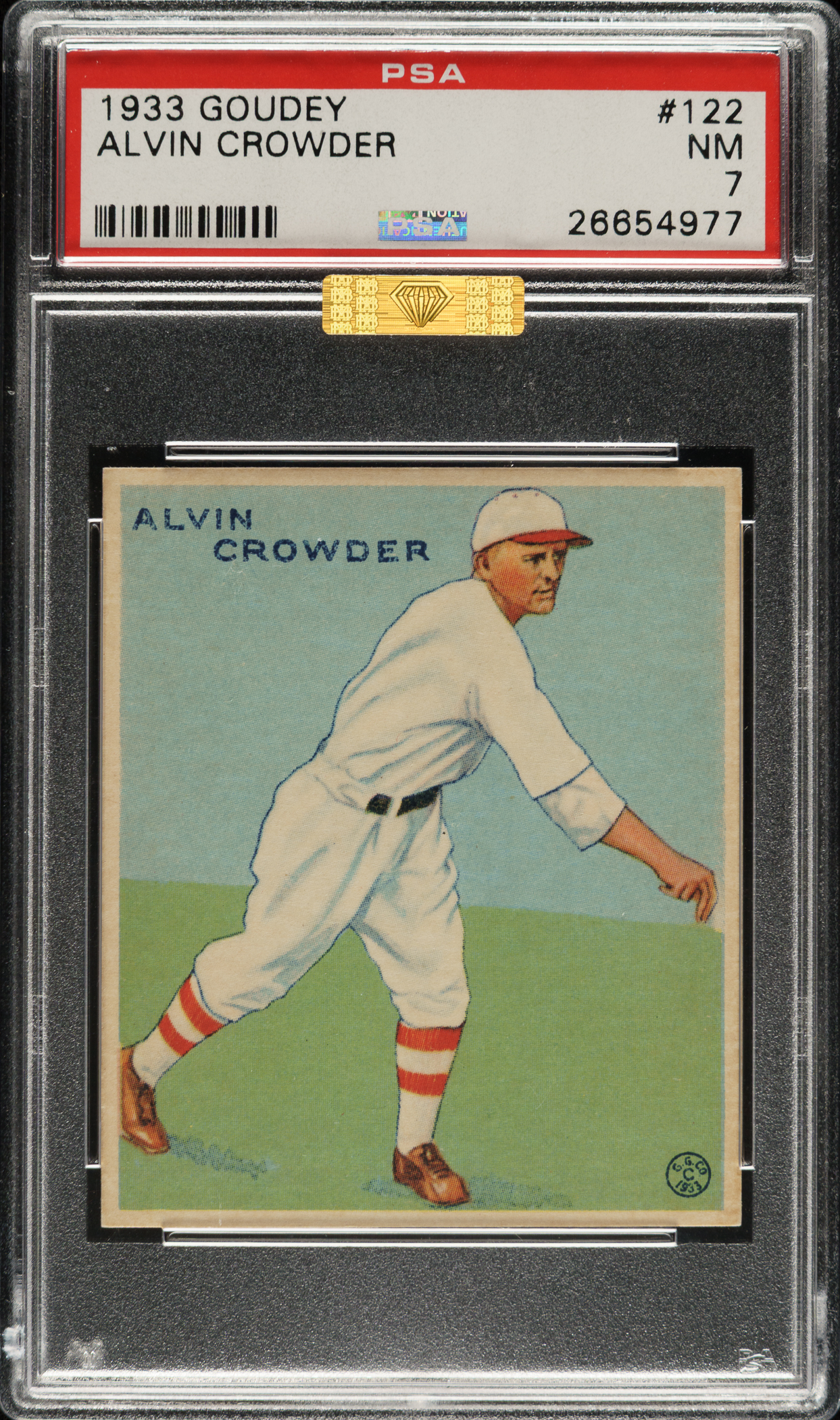 Graded NM 7 by PSA. Washington Senators. Awarded an MBA Gold Diamond by Mike Baker Authenticated for high-end eye appeal. A corresponding MBA sticker is affixed to the front of the holder.