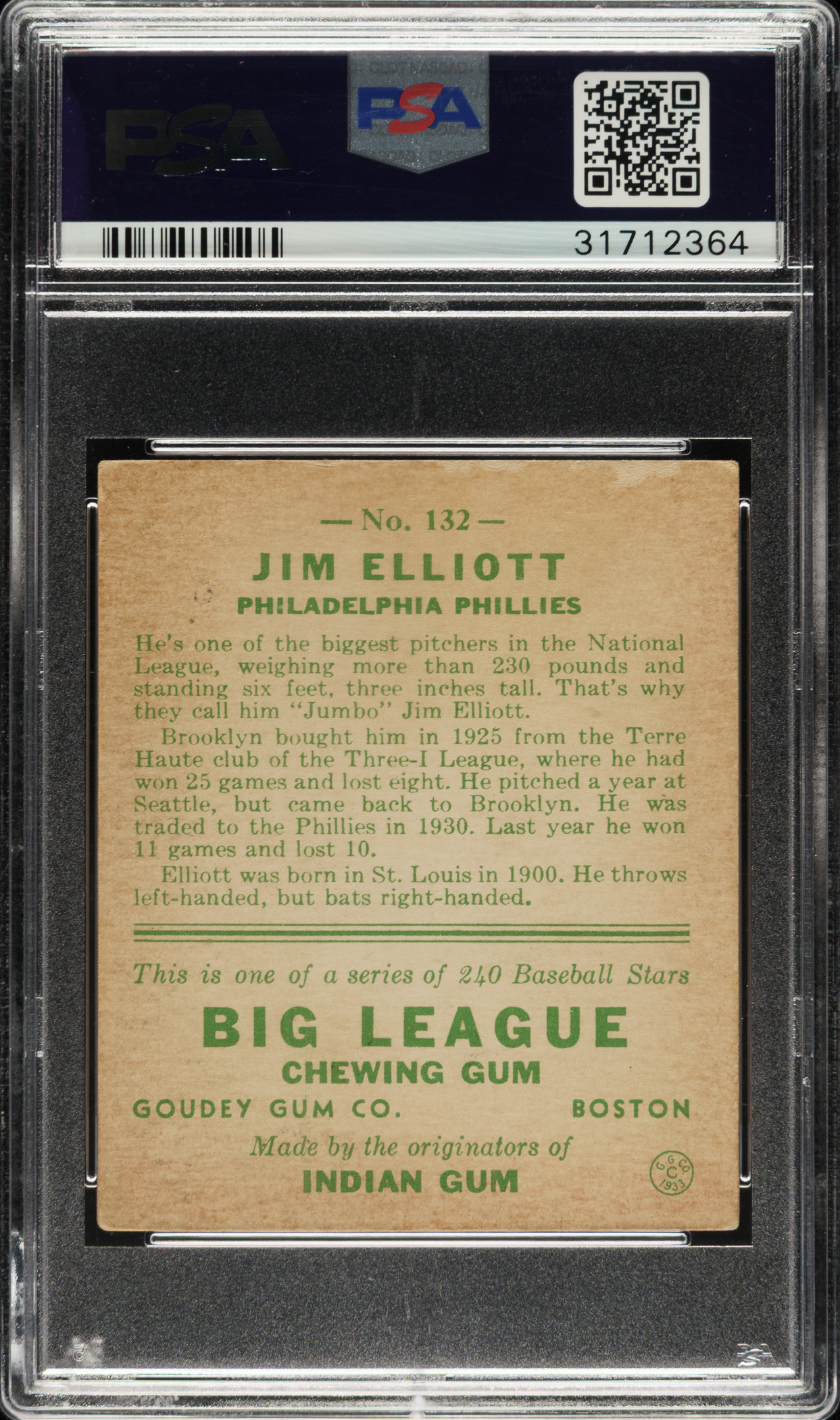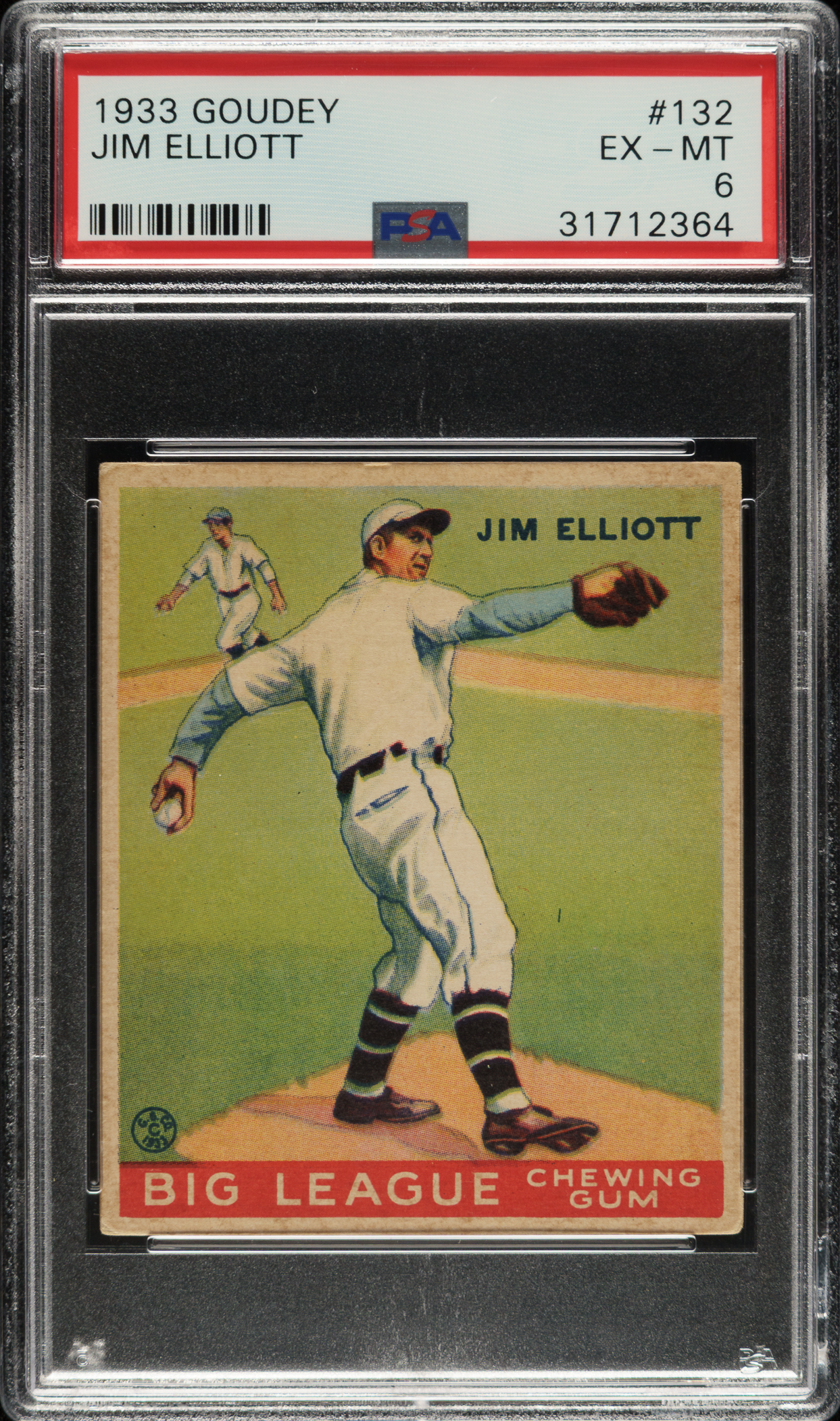 Lot # 826: 1933 R319 Goudey #132 Jim Elliott PSA EX-MT 6