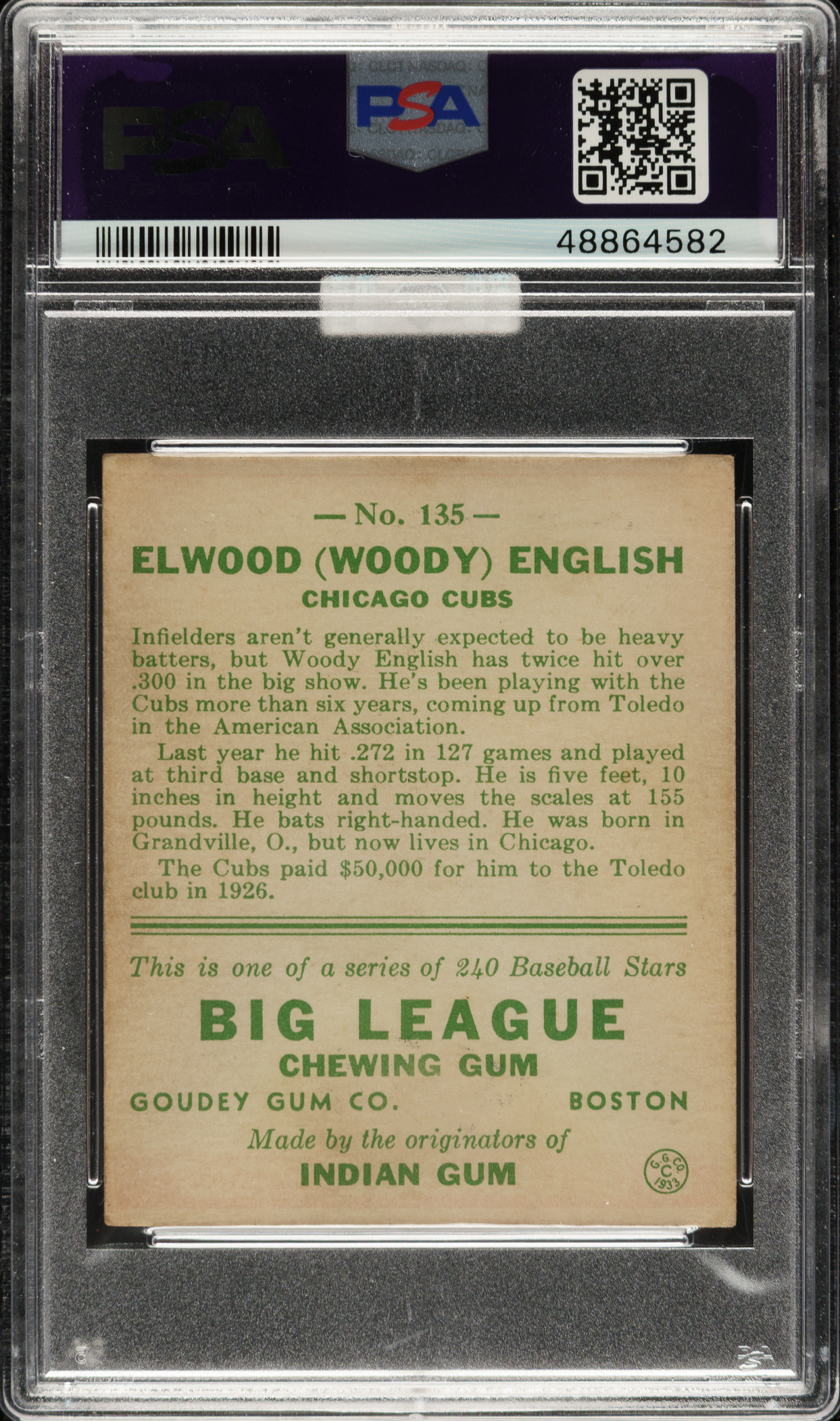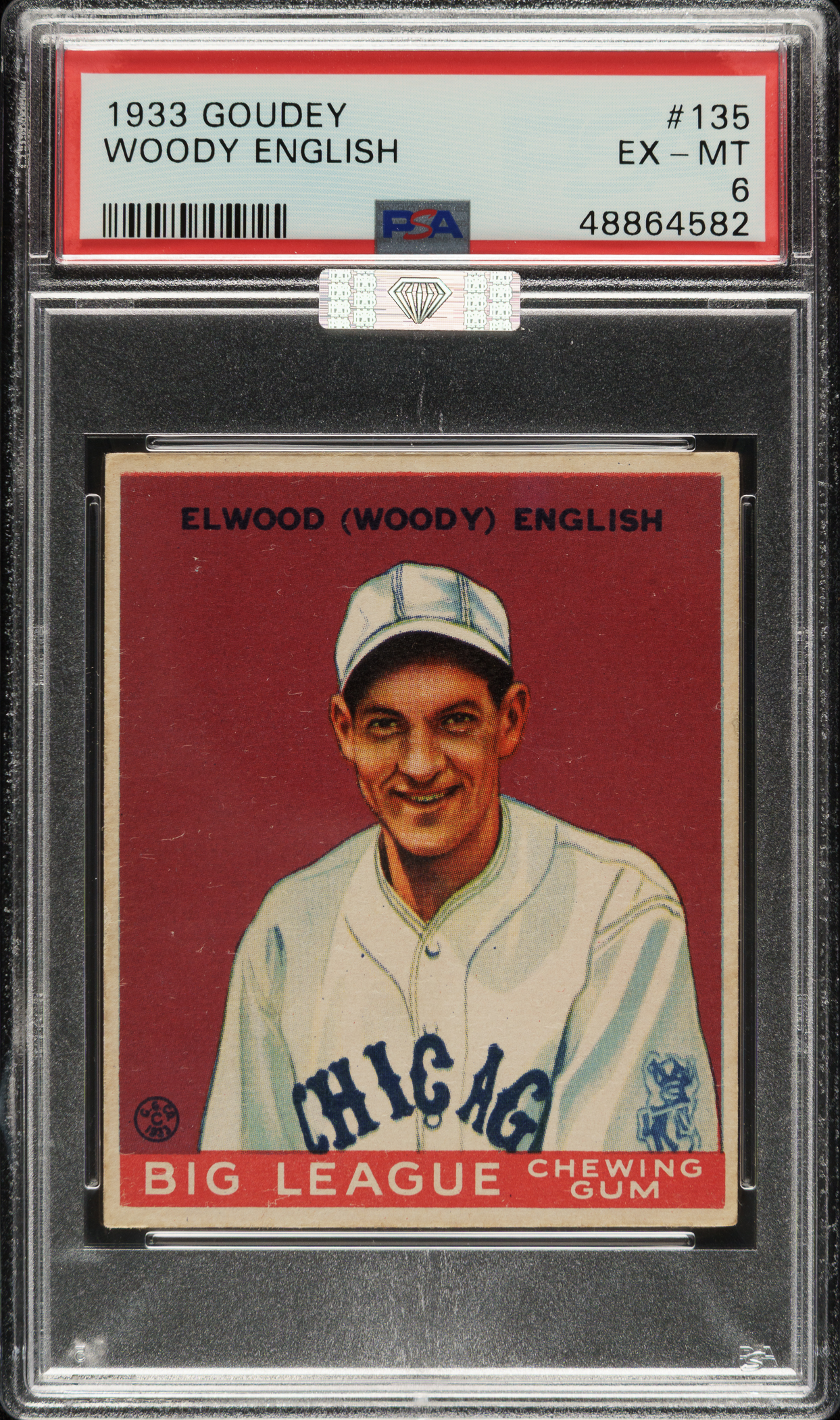 Graded EX-MT 6 by PSA. Chicago Cubs. Awarded an MBA Silver Diamond by Mike Baker Authenticated for high-end eye appeal. A corresponding MBA sticker is affixed to the front of the holder.