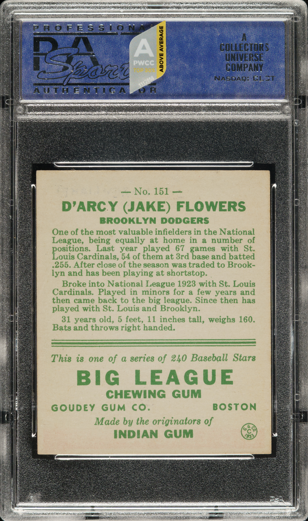 Lot # 852: 1933 R319 Goudey #151 Jake Flowers PSA NM 7