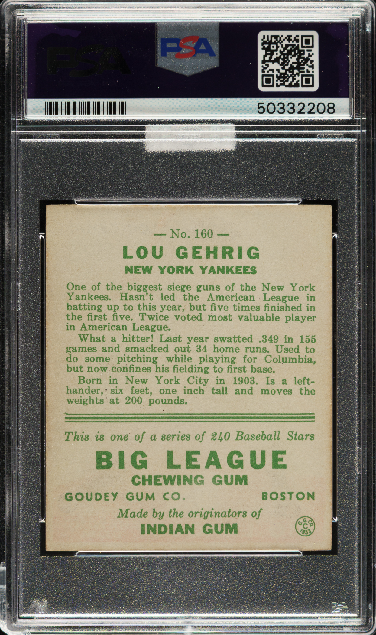 Graded NM 7 by PSA. Extremely high-grade example of one of the most popular of all Lou Gehrig cards and one of the most desirable of all 1930s bubble-gum cards. Bright and clean, both front and back, with a crisp image, and strong corners. Bold green text on the reverse. This is a tremendous example of one of Lou Gehrig's most important and highly prized baseball cards. Awarded an MBA Gold Diamond by Mike Baker Authenticated for high-end eye appeal. A corresponding MBA sticker is affixed to the front of the holder.