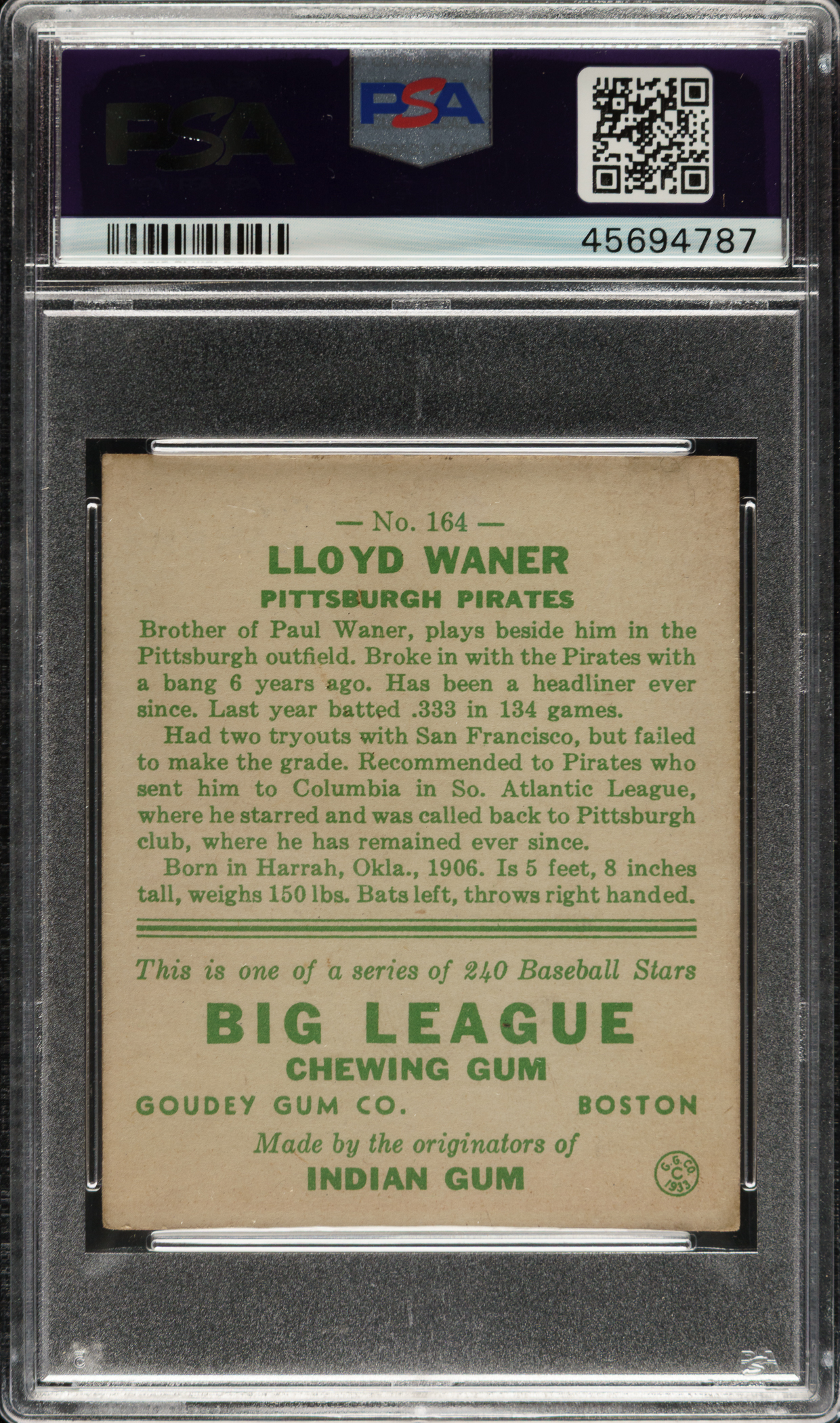 Graded EX 5 by PSA. Pittsburgh Pirates Hall of Famer Lloyd Waner.