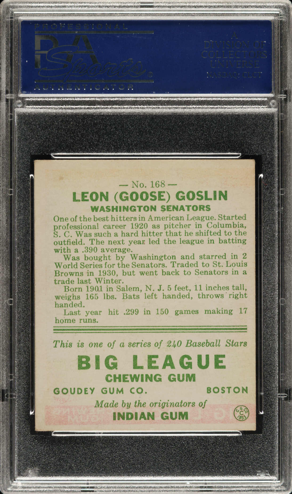 Graded EX 5 by PSA. Washington Senators Hall of Famer Goose Goslin.