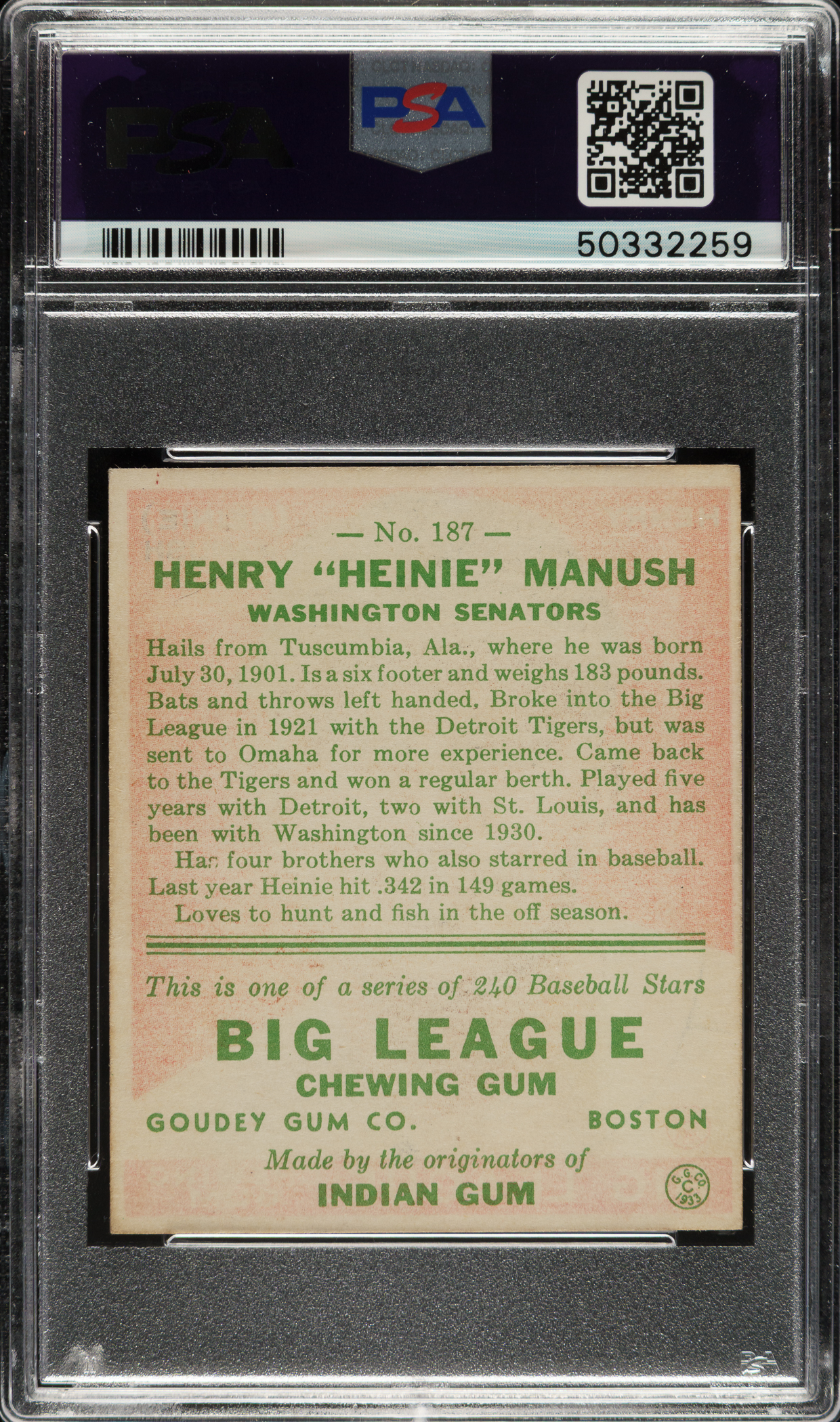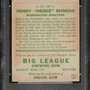 Graded NM 7 by PSA. Washington Senators Hall of Famer Heinie Manush.