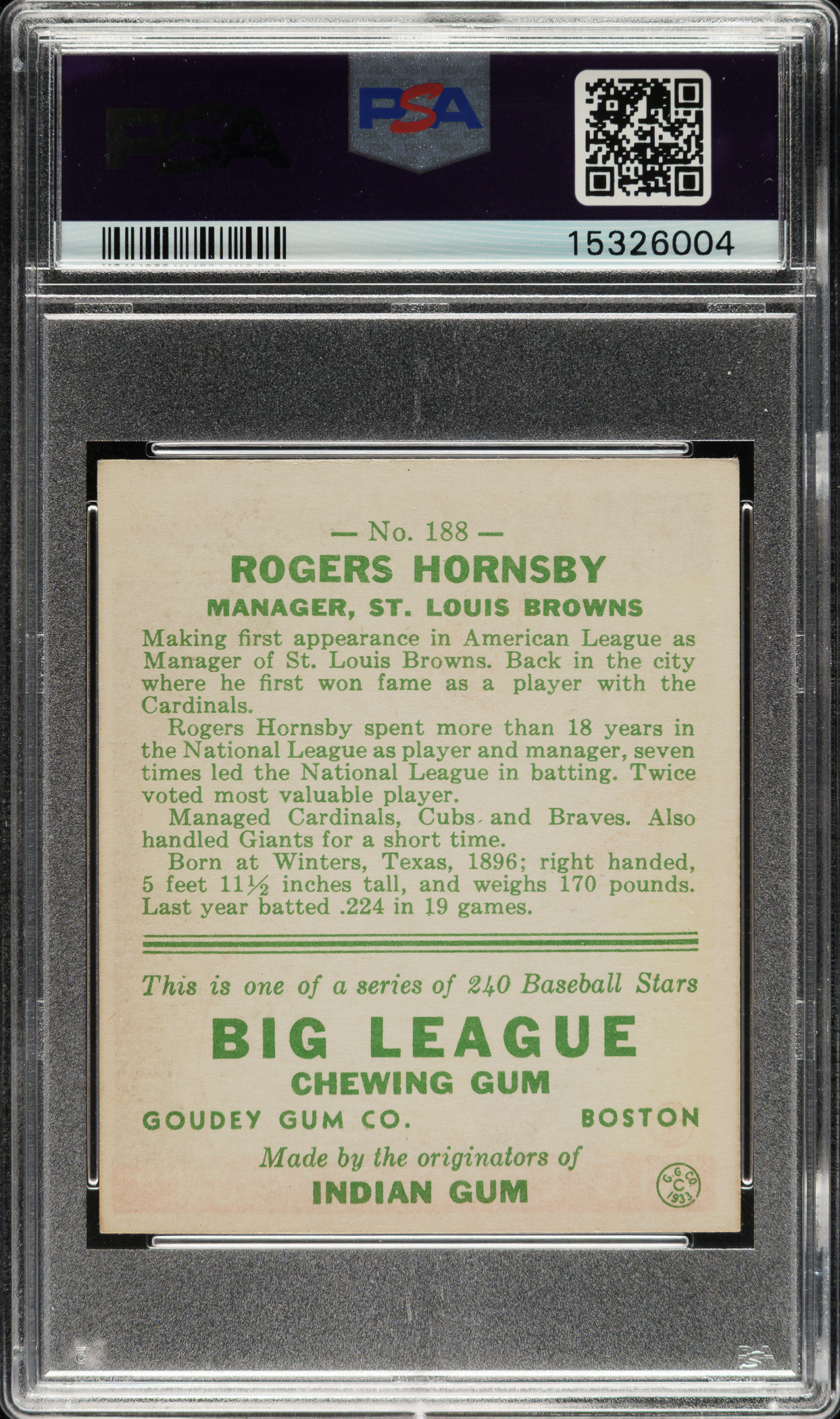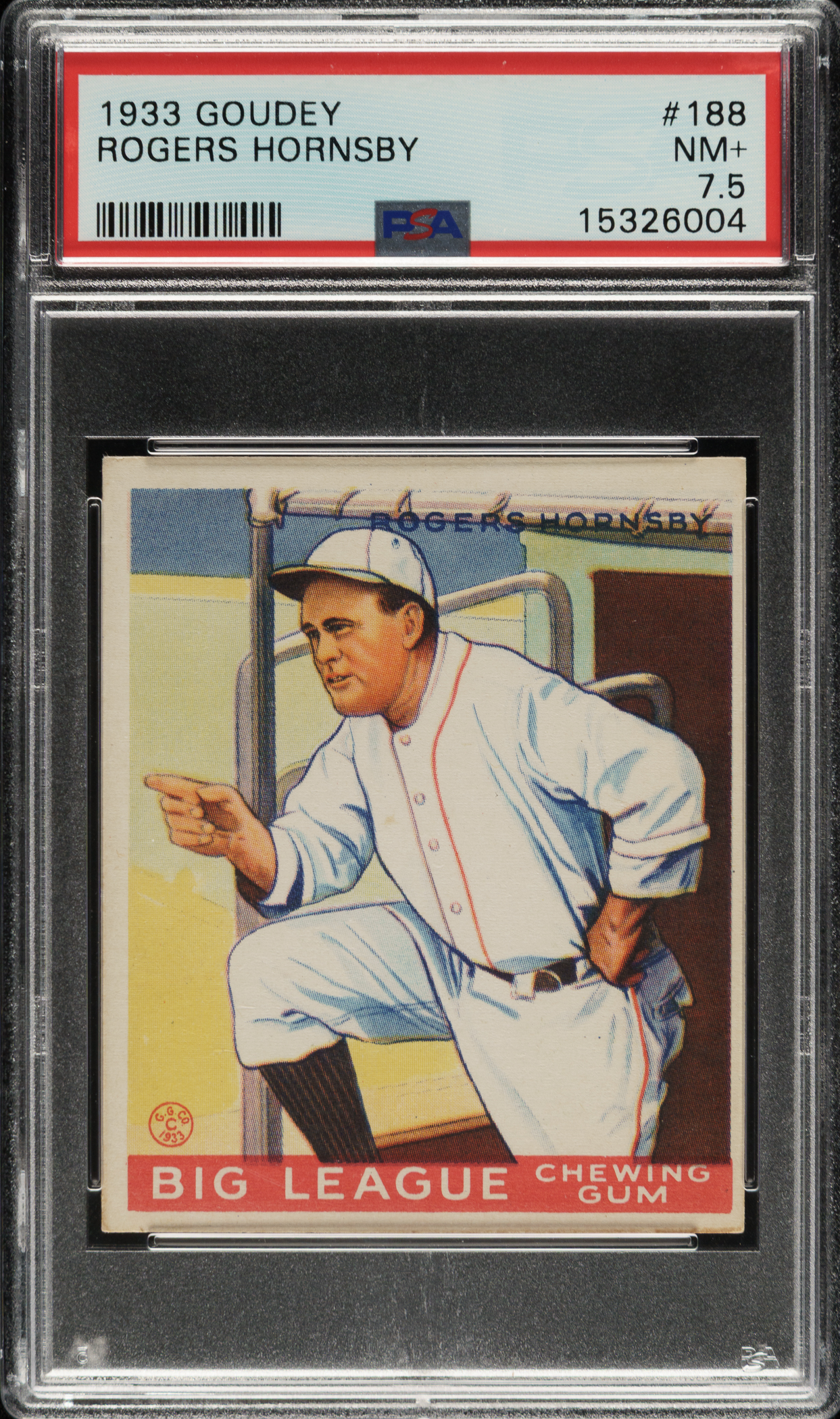 Graded NM+ 7.5 by PSA. Outstanding high-grade example of St. Louis Browns Hall of Famer Rogers Hornsby (#188) from the 1933 Goudey set. This example exhibits vibrant colors, impressive registration, and strong corners. Clean reverse with bold green text. A beautiful high-grade PSA example.