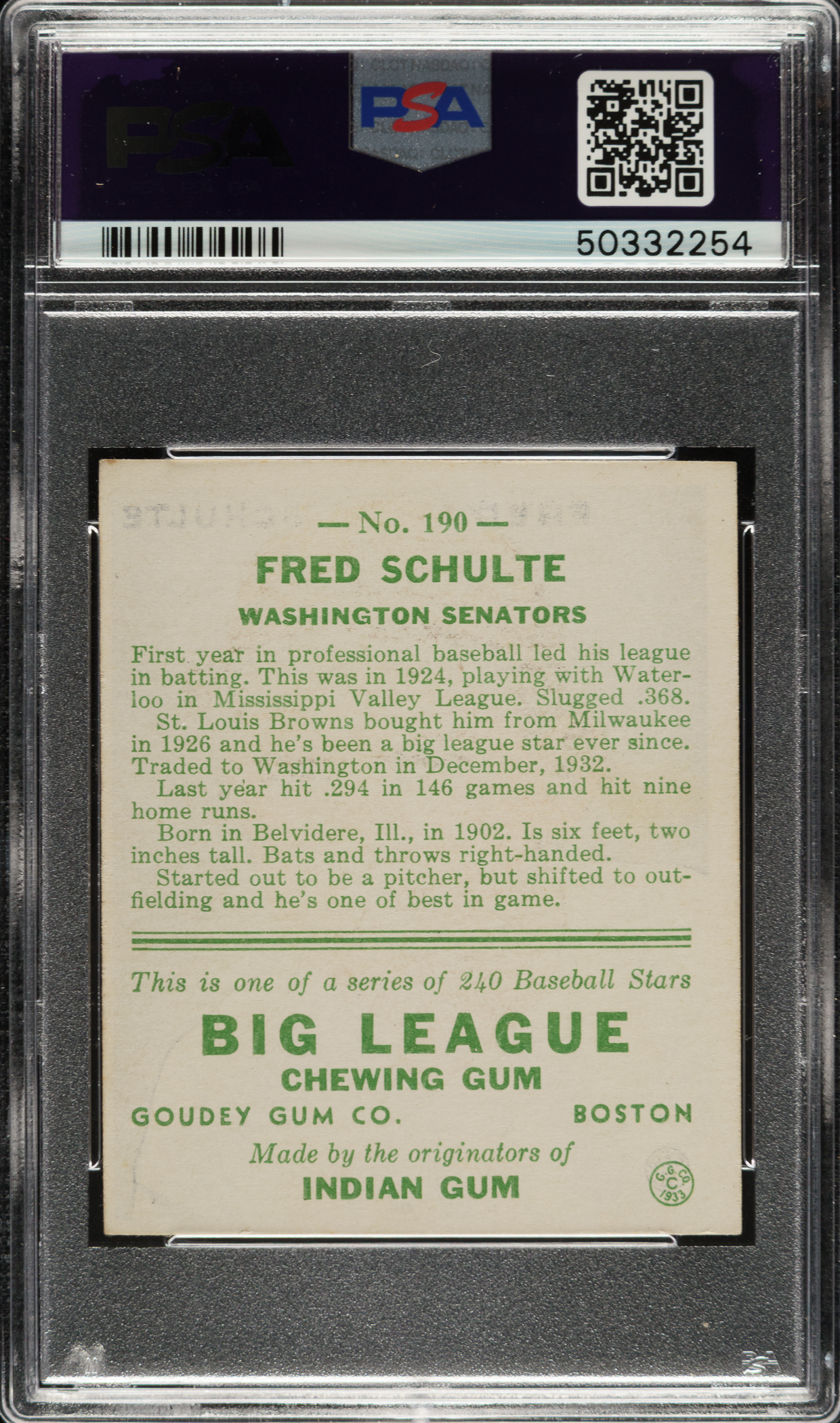 Lot # 894: 1933 R319 Goudey #190 Fred Schulte PSA NM 7