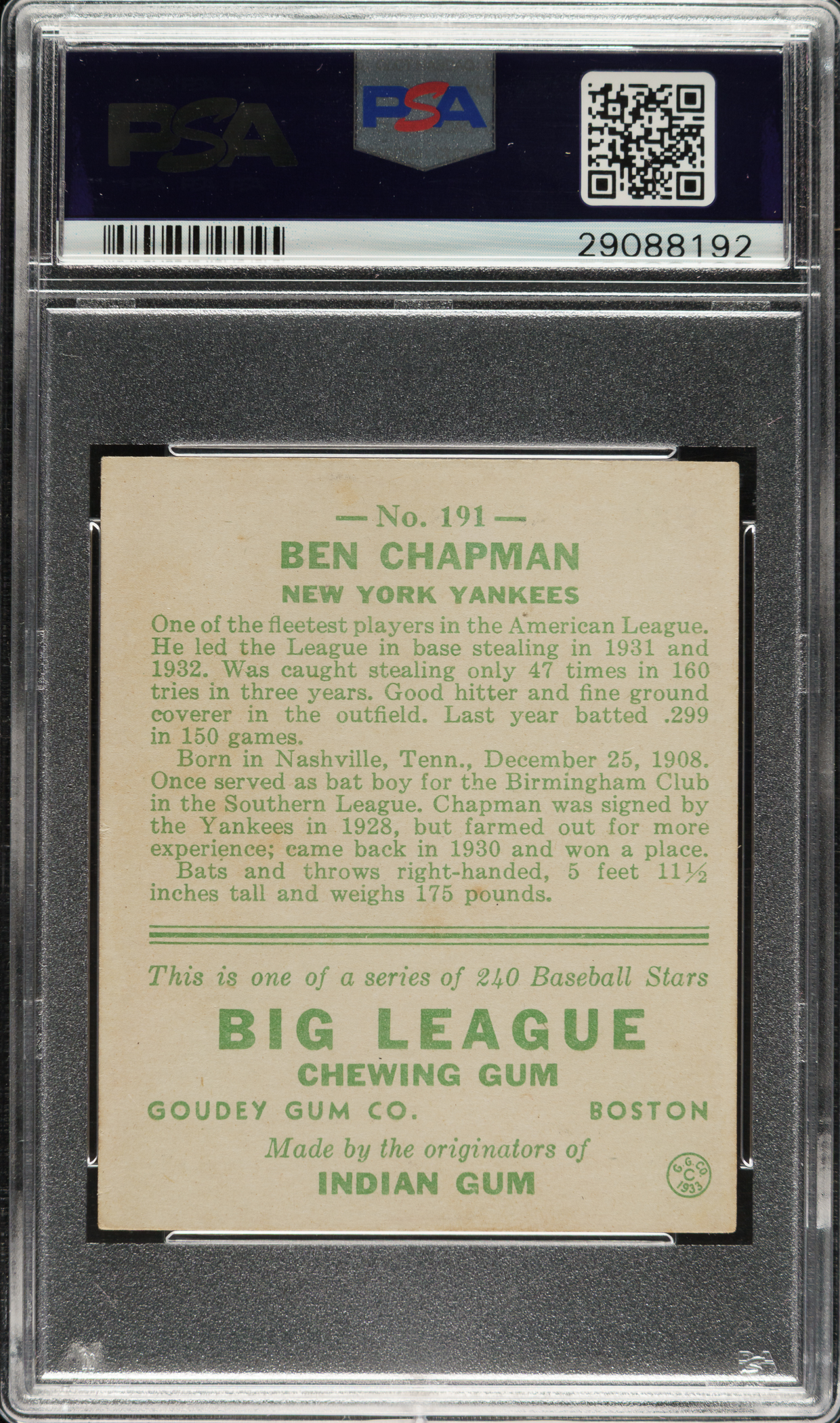 Lot # 896: 1933 R319 Goudey #191 Ben Chapman PSA EX-MT 6