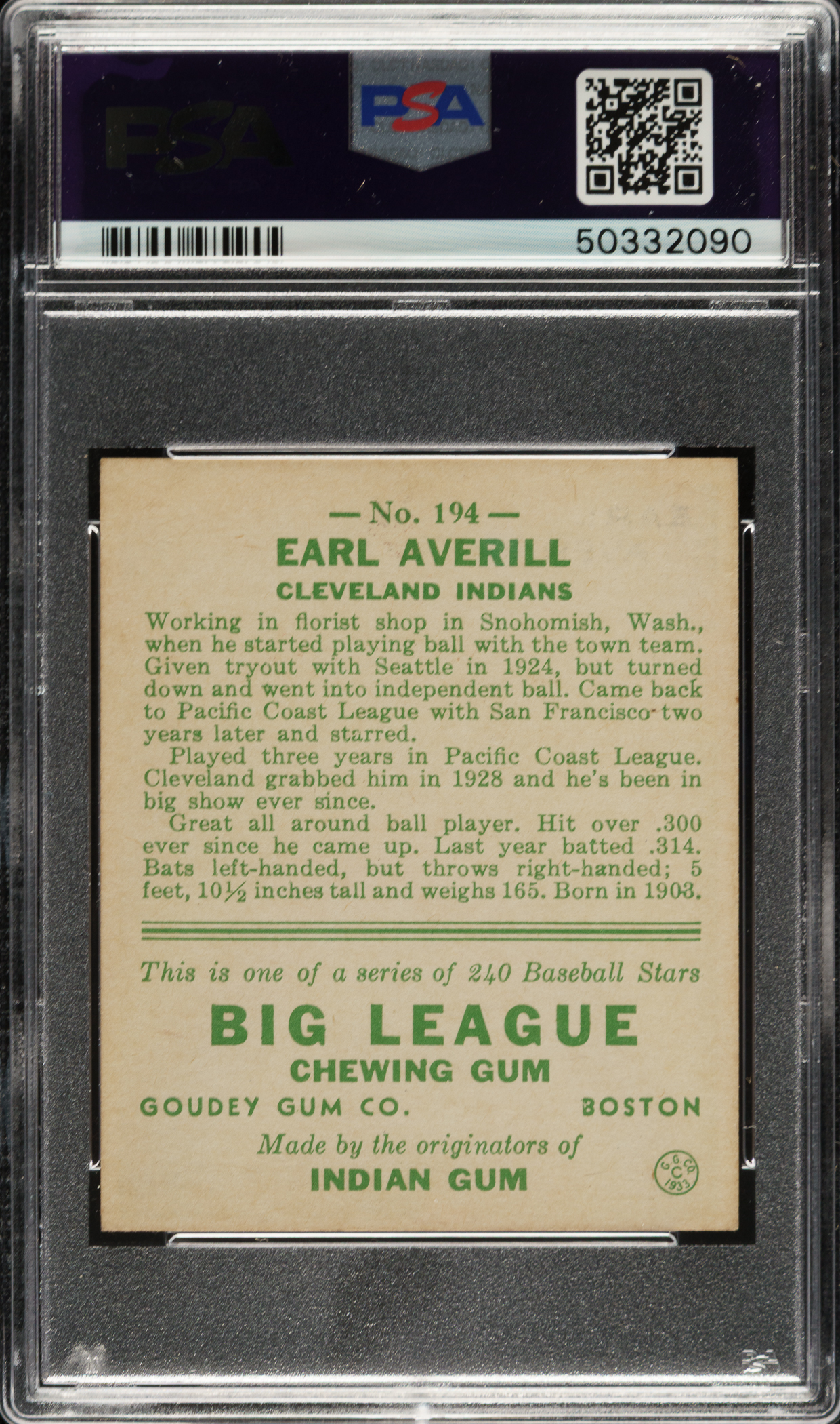 Graded NM 7 by PSA. Cleveland Indians Hall of Famer Earl Averill.
