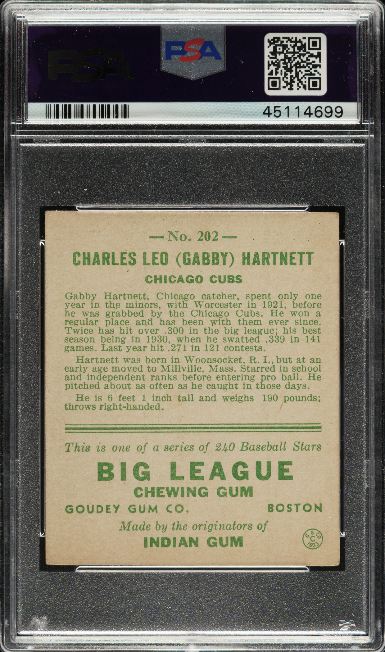 Graded EX-MT 6 by PSA. Chicago Cubs Hall of Famer Gabby Hartnett.