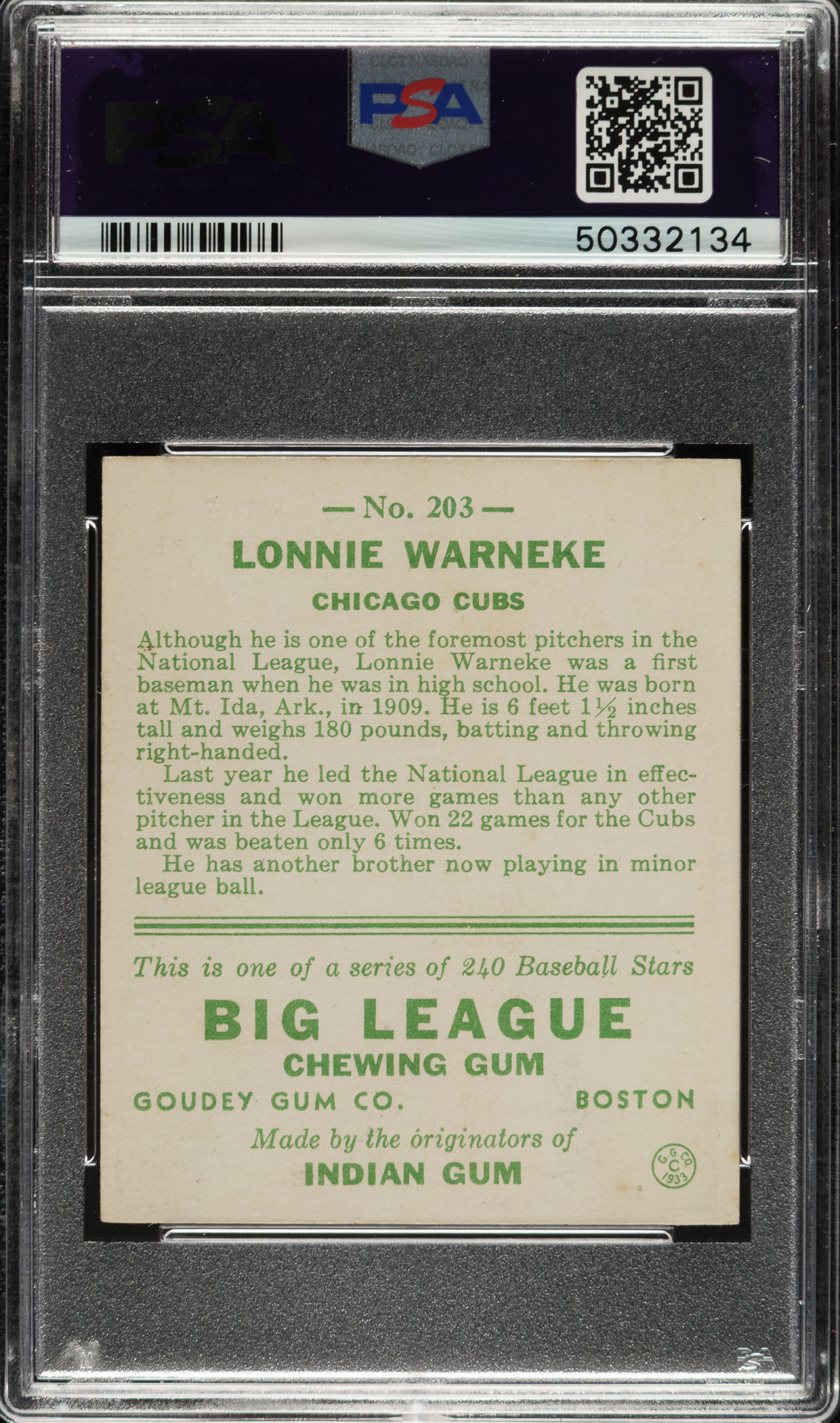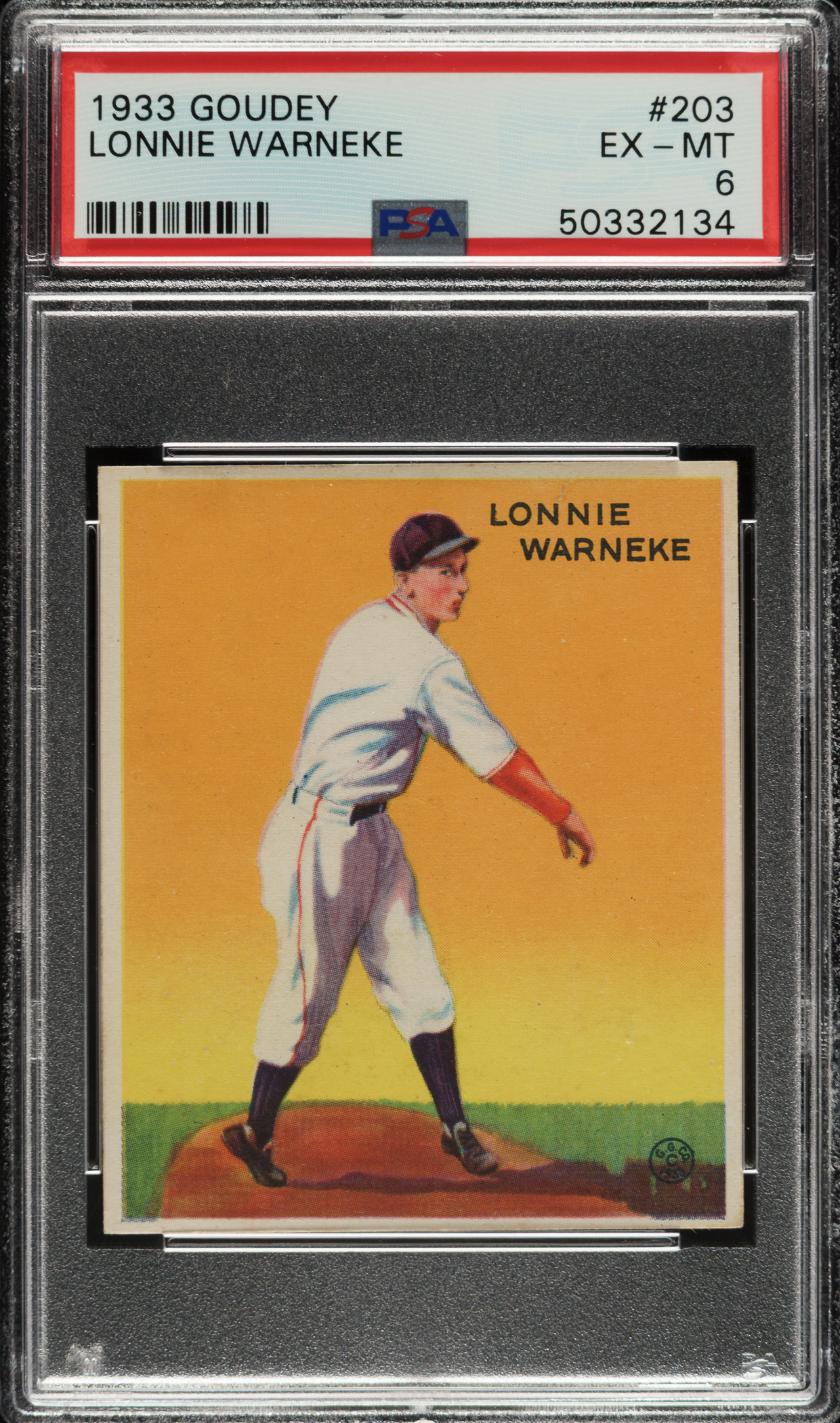 Lot # 908: 1933 R319 Goudey #203 Lonnie Warneke PSA EX-MT 6