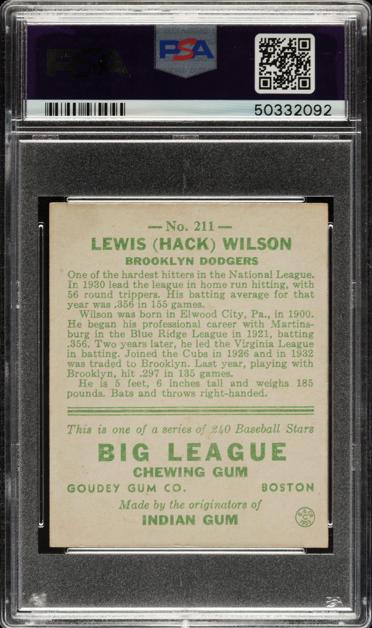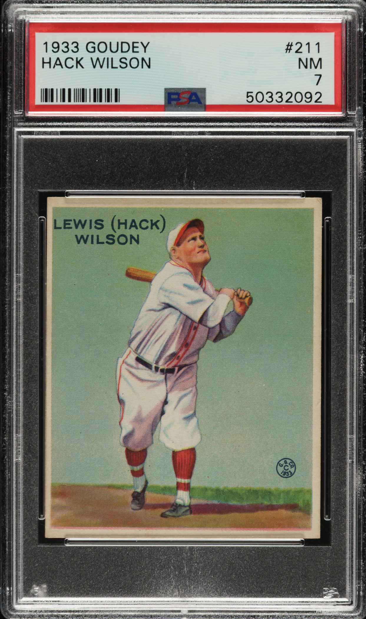 Graded NM 7 by PSA. Superb high-grade example of Brooklyn Dodgers Hall of Famer Hack Wilson (#211) from the 1933 Goudey set. The offered card features brilliant colors, clean off-white borders, and strong corners (weaker top right). Clean reverse with bold green text. In 1930, his finest season, Hack Wilson set two legendary marks. His 56 home runs were a National League record that stood until 1998 when Mark McGwire and Sammy Sosa both shattered it. Nevertheless, his single-season record of 191 RBI still stands from that year. Though contenders for the record have come close, no player has gotten within 25 RBI of the mark since 1938. This is a beautiful high-grade PSA example of one of Hack Wilson's classic cards.